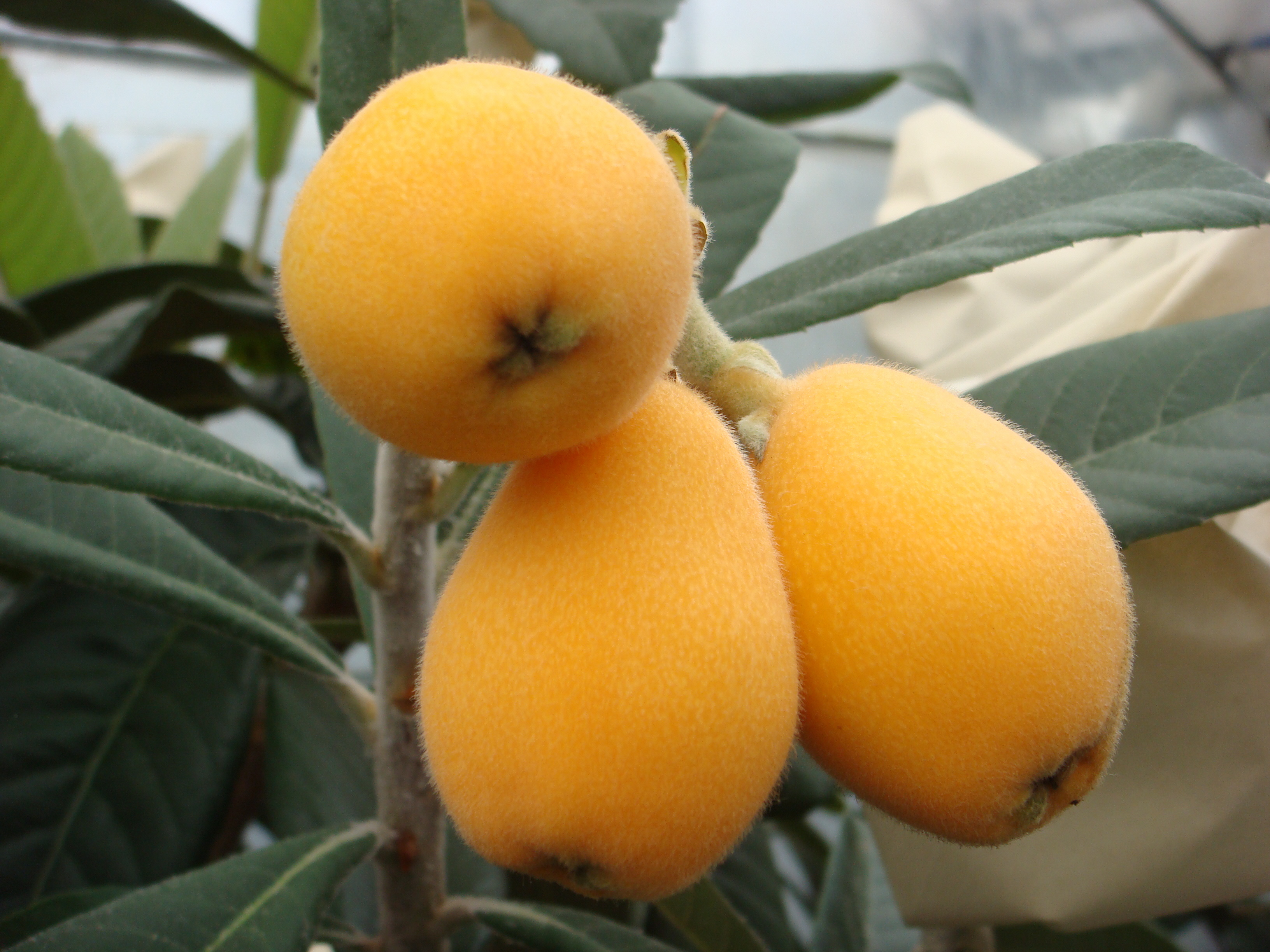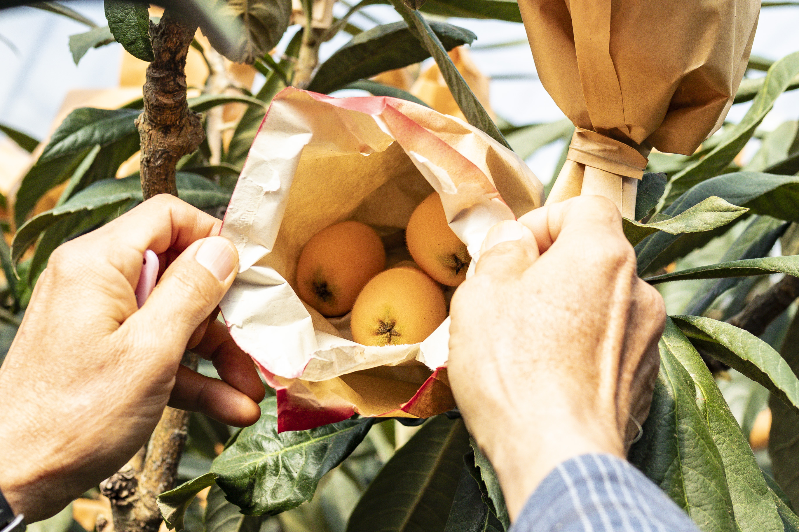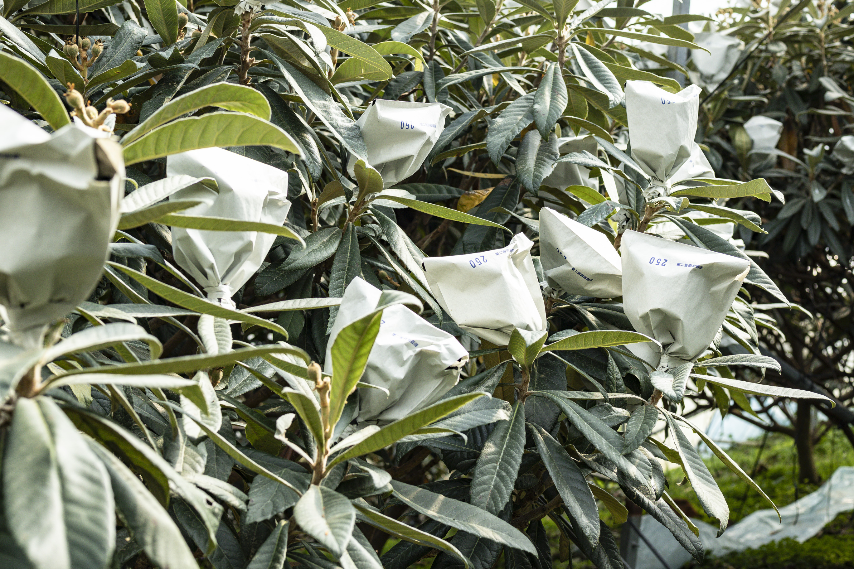 枝先には、たくさんの袋がかけられています。びわ栽培ならではの光景で、今回撮影したハウス内だけで40本の木があり、袋の数はなんと6,000にも及ぶそうです。単純計算すると、1本の木に150袋もかけるという途方もない数字。それを一つひとつ手作業で行う気の遠くなるような作業です。