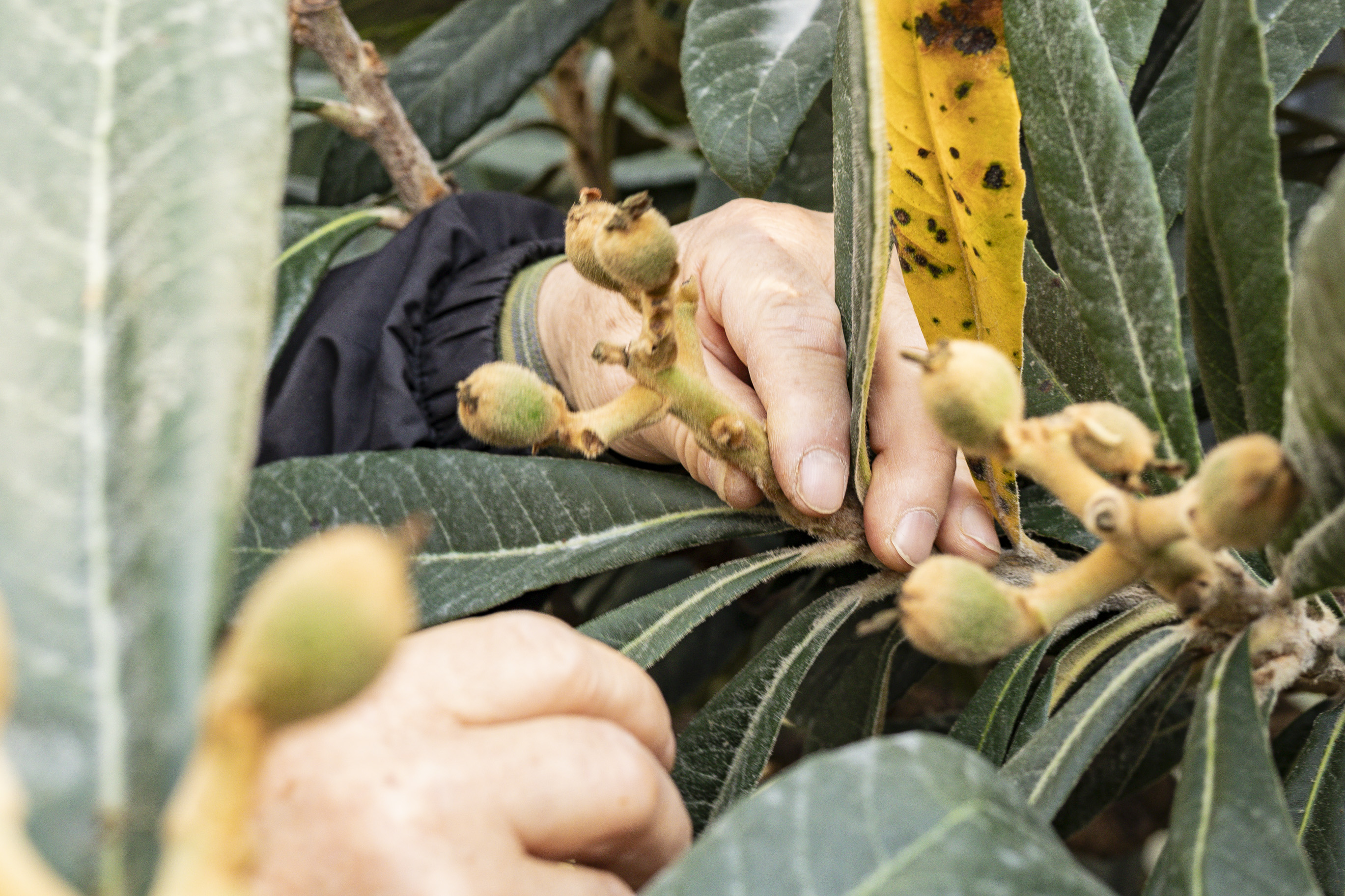 収穫の際も、細心の注意が必要です。びわの表面を覆う細かな産毛が傷つくと、そこから身が黒くなり、商品価値が損なわれるそうです。しかも、素手で触れただけで、そうなってしまうほど産毛は繊細。森部さんはじめ熟練のびわ農家の方は、実を触らずに軸だけを持って一つひとつ丁寧に収穫していくのだそうです。慣れや経験がなければ務まらない収穫作業です。「手のかかる、甘えんぼうさ。大事に育ててやればおいしくなるもんね」と木を見上げながら話す森部さん。