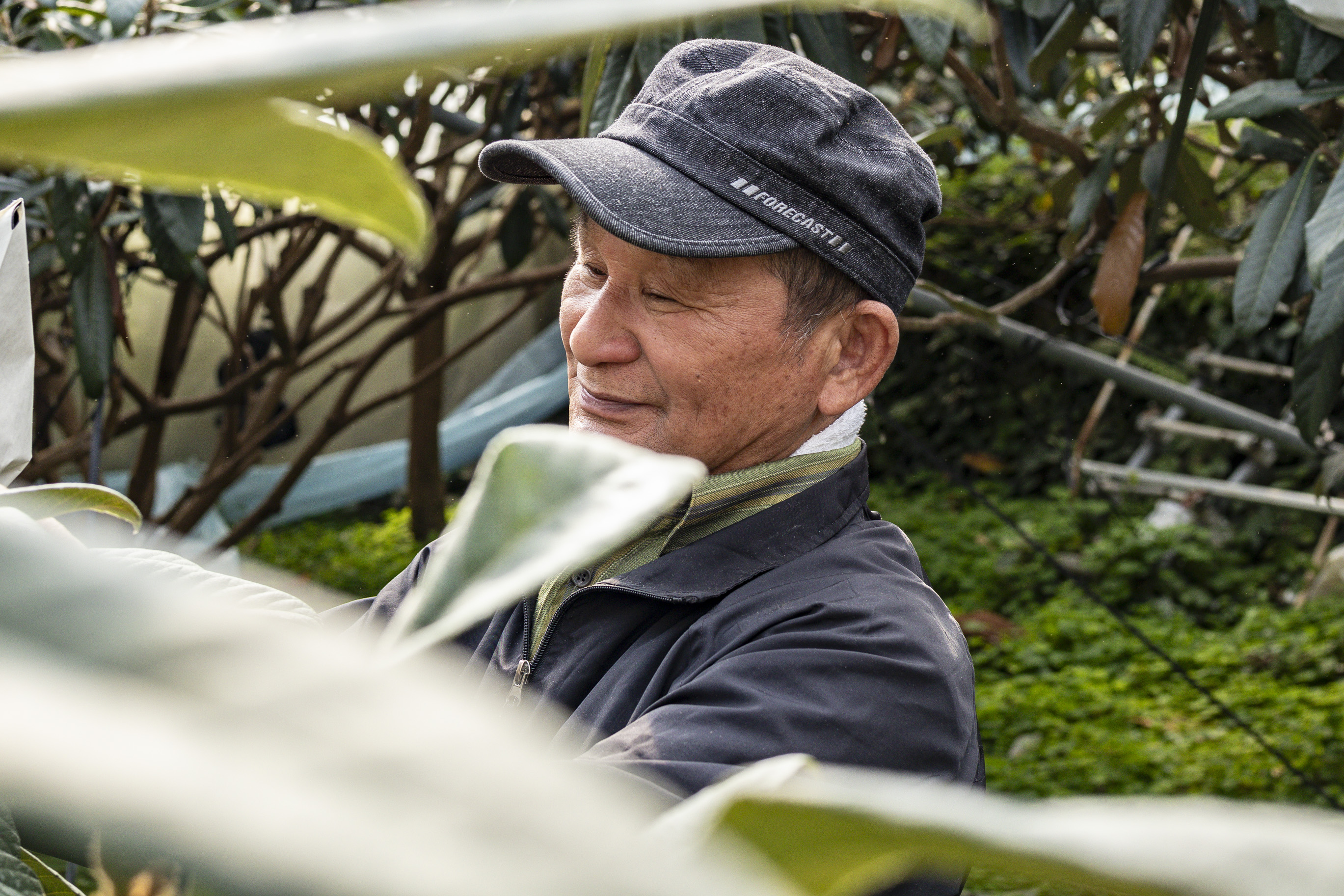 長崎市内中心部から南に30分ほど走った場所にある三和(さんわ)地区。長崎市内でもびわ栽培が広く行われている地域です。取材に訪れた3月初旬は、収穫までもうあと一息の大切な時期。ハウスの中では、この道30年の経験を持つ森部 高さんがびわの生育状況をチェックしていました。