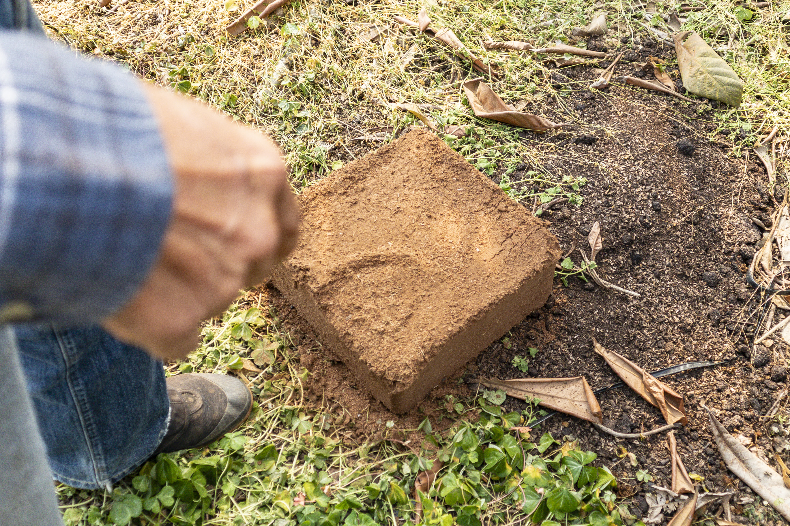 地面に目を向けると、見慣れないふかふかとしたブロック状の塊が等間隔に置かれていました。これはパームヤシのチップを原料とする土壌改良剤で、土の排水性や通気性を高め、力強い根を張る作用があります。びわは地中の根と地上の枝が連動して大きくなるため、枝先の真下あたりに置くことで、根の成長を助け、立派なびわができるのです。