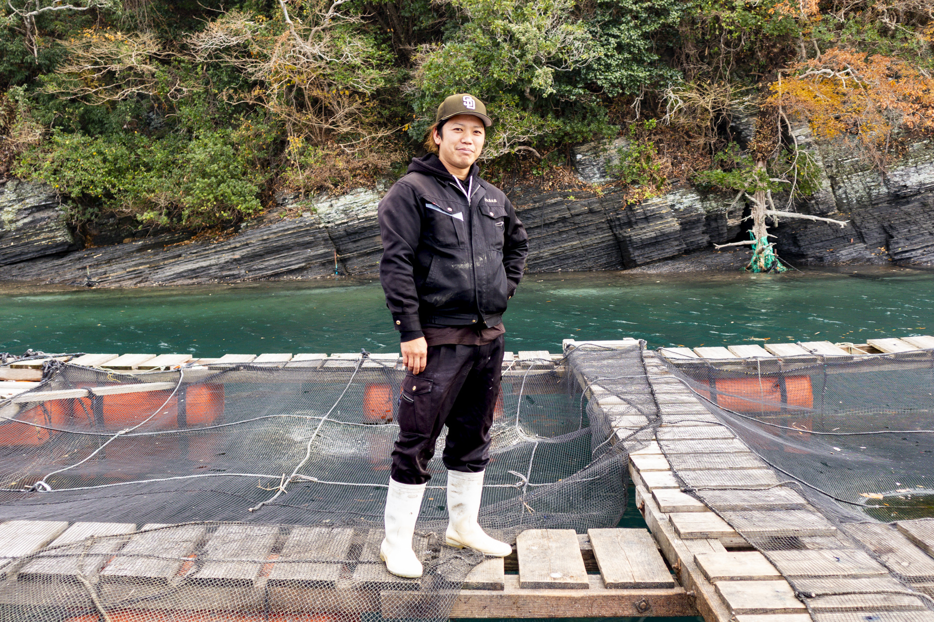 その思いから生まれたのが、自社養殖の「丸徳鯖刺身」。提供する日の朝に水揚げをするため、鮮度抜群の状態で提供できる看板メニューです。「せっかくなら、いけすも見ていきますか」という犬束さんの誘いに甘えて、店から車で10分ほどの丸徳水産におじゃますることにしました。