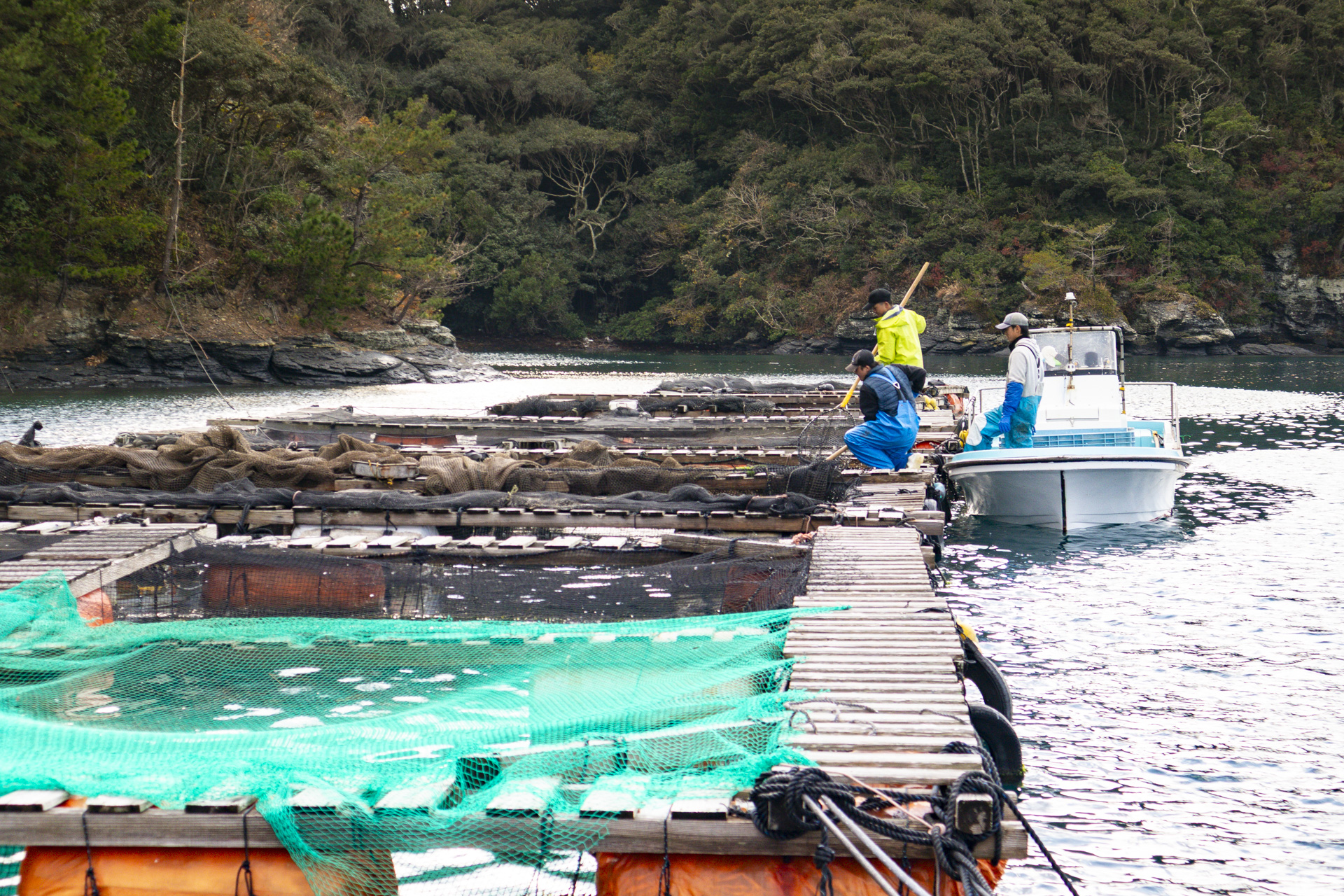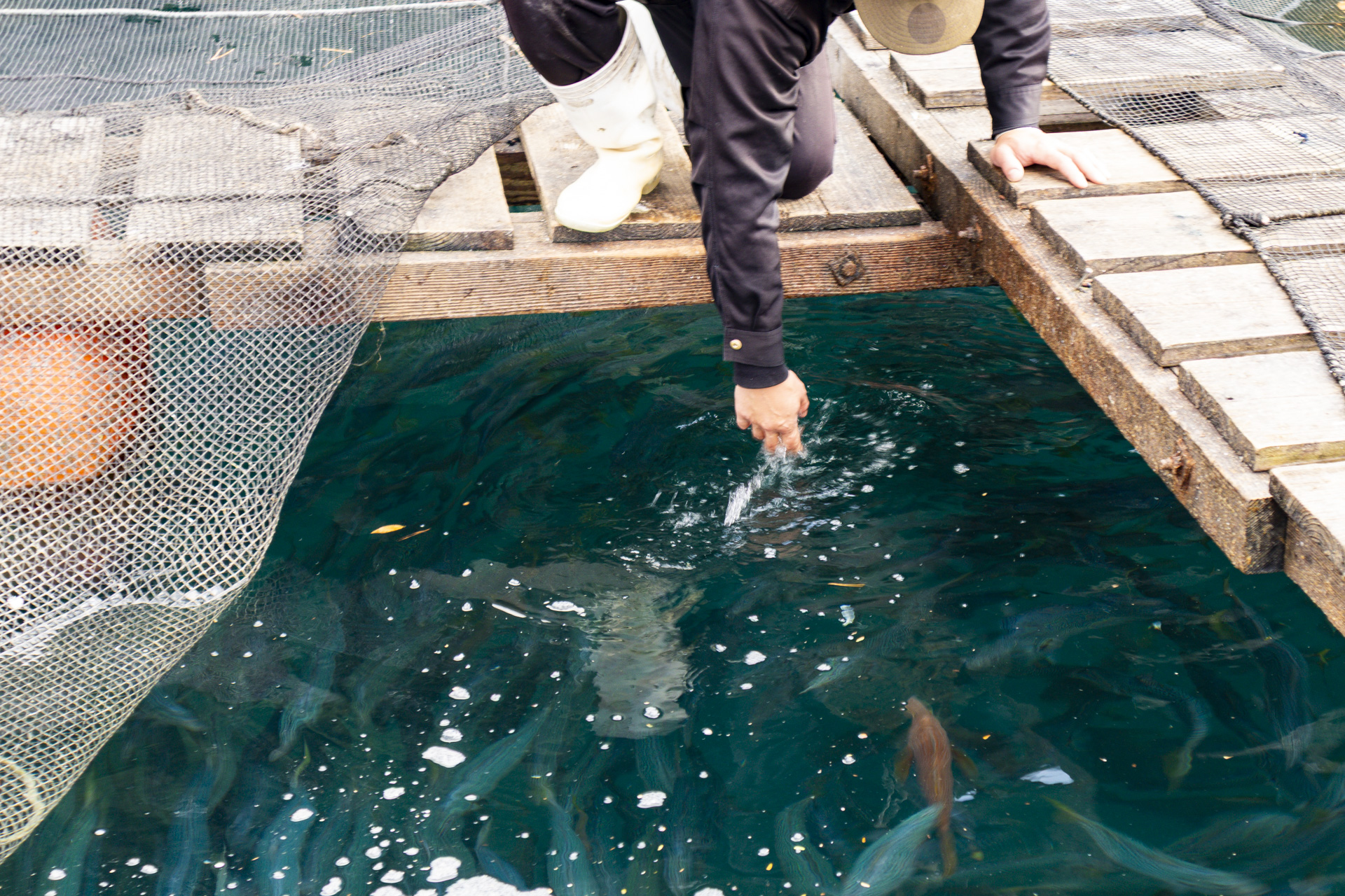 迎えてくれたのは、犬束さんの次男の弘法(ひろのり)さんです。港から船で2〜3分のところにあるいけすには、おびただしい数のサバが泳いでいました。「今いけす1つあたり700匹くらいですね。年末に向けてたくさん水揚げしたので、少ない方です」と弘法さん。