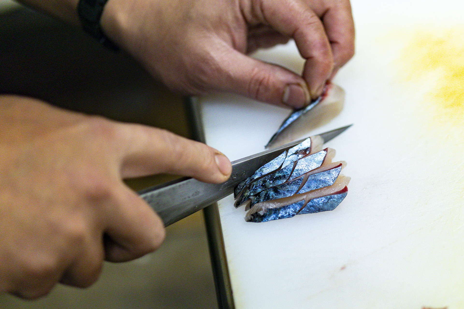 その新鮮さと味に太鼓判を押す弘法さん。「水揚げした後に、すぐさばいておろすので、えんの場合、早いと締めて5分後にはお刺身になることも。だから、すごくおいしいんです」。