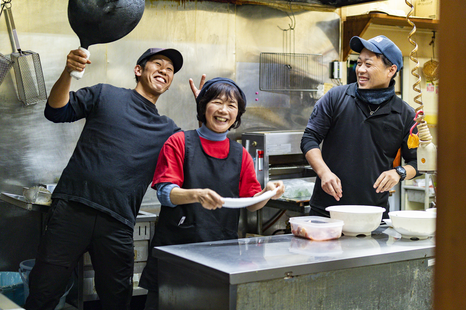 (写真右から、厨房の小島辰則さん、犬束ゆかりさん、犬束さんの長男・弘介さん)