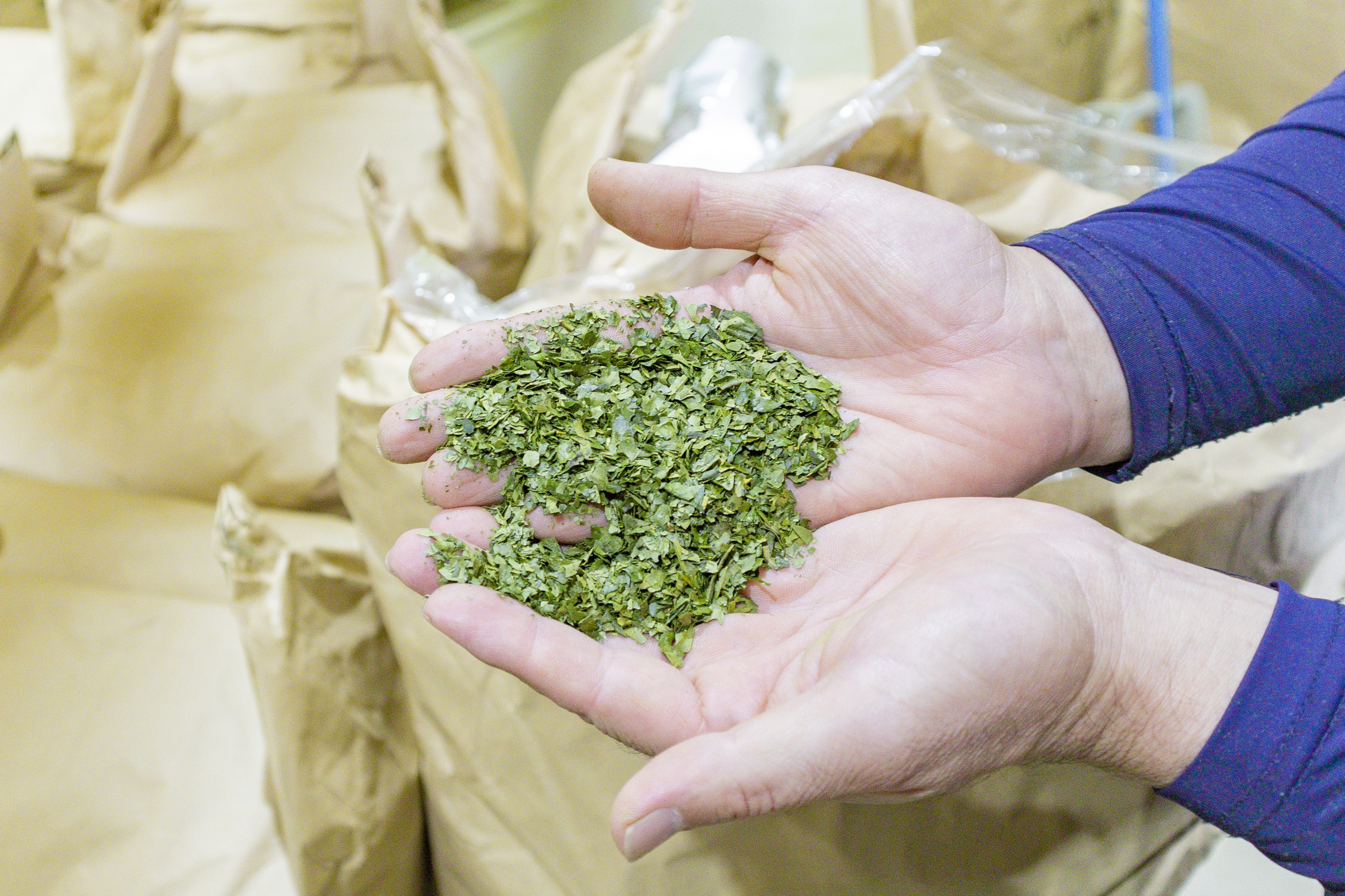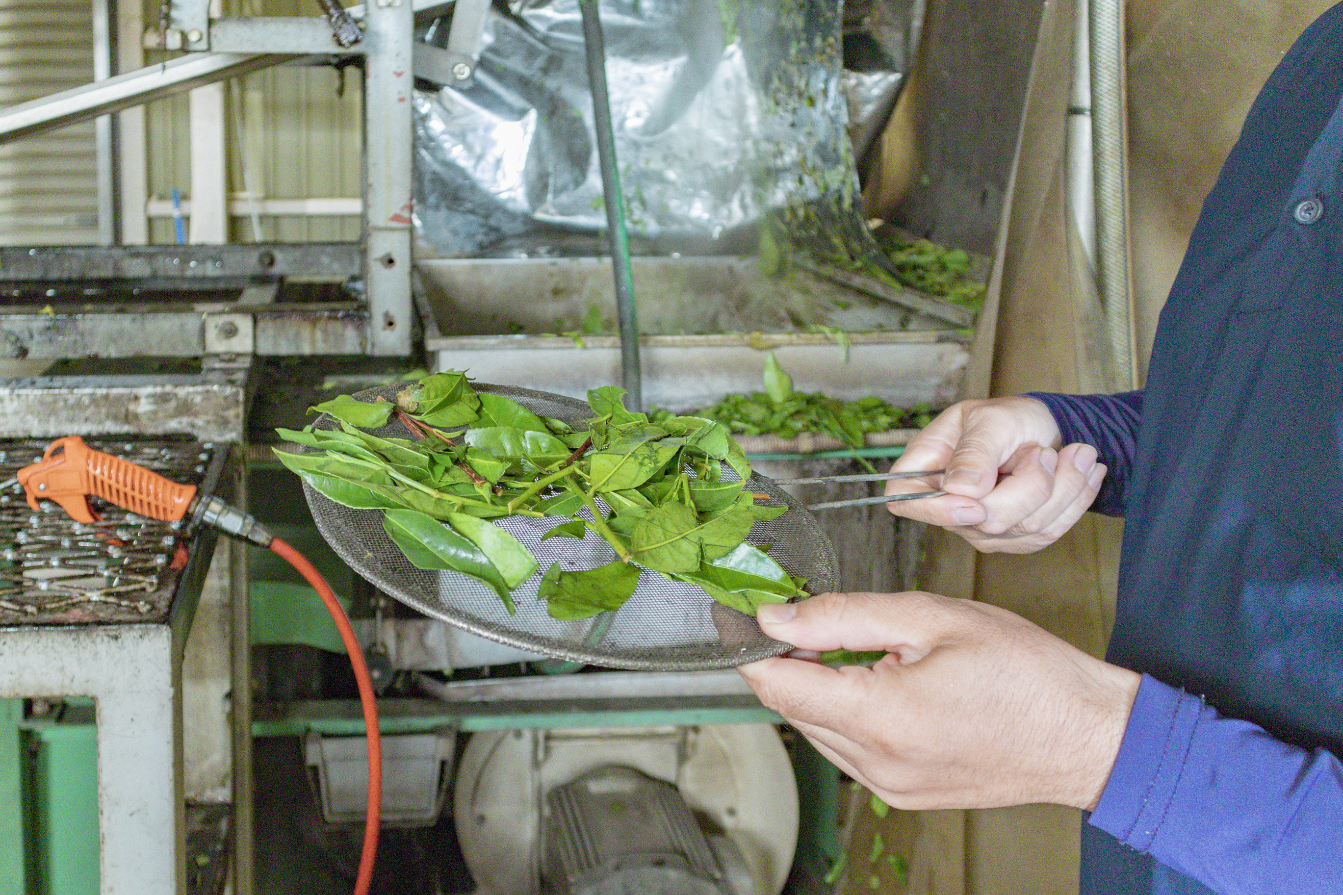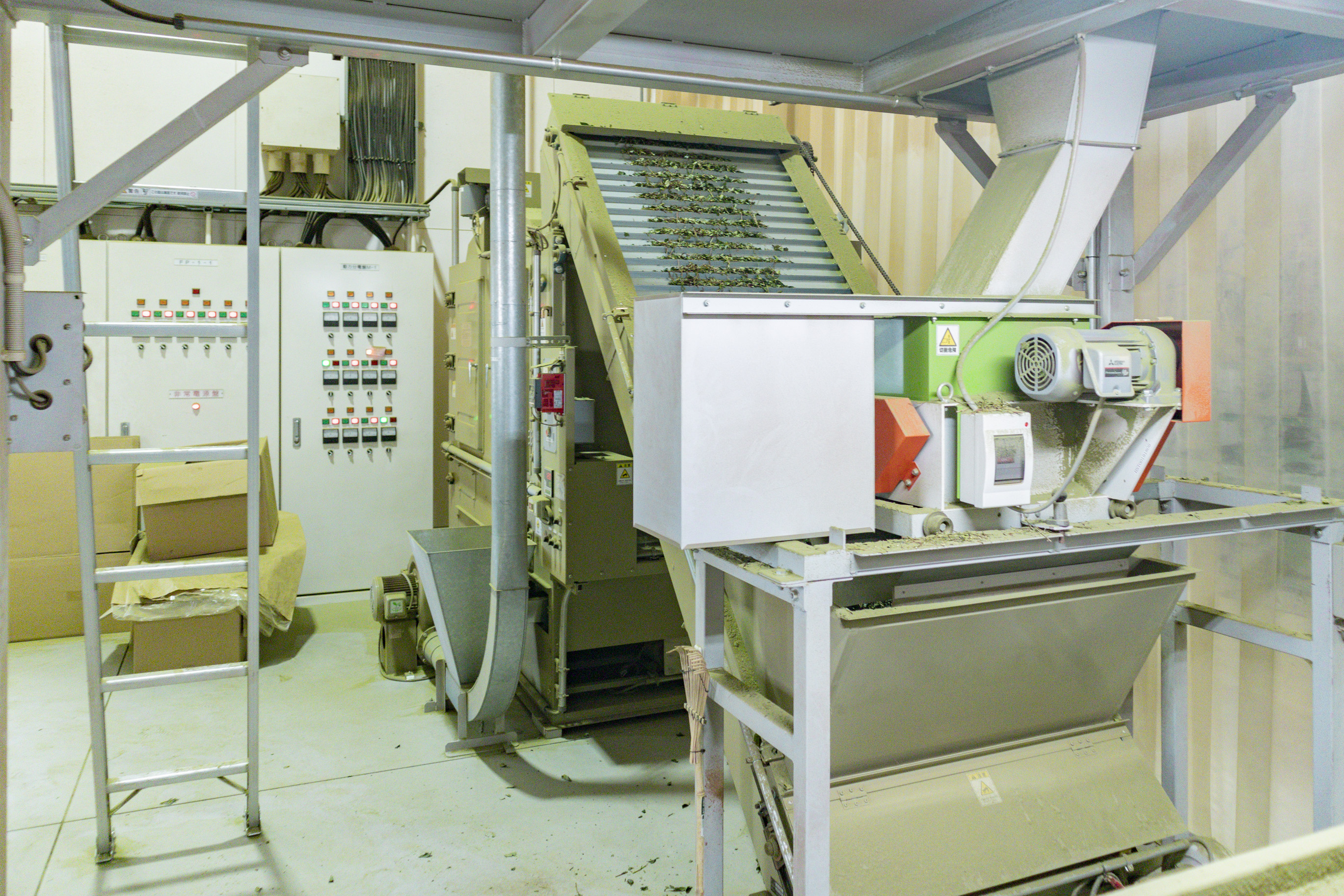 工場内には、青々とした香りが漂います。収穫されたばかりの茶葉は、高温で短時間蒸された後に、葉の温度を下げ、湿り気を飛ばすため、散茶機にかけられます。高さ8メートルもの巨大な散茶機の中で、茶葉が風に舞って上下しています。その後、約220℃のてん茶炉で乾燥させ、蒸す工程から30分ほどで、乾燥茶葉になります。収穫したその日の茶葉を急速処理することで、鮮やかな色と香りを損なわないてん茶ができあがるのだそうです。