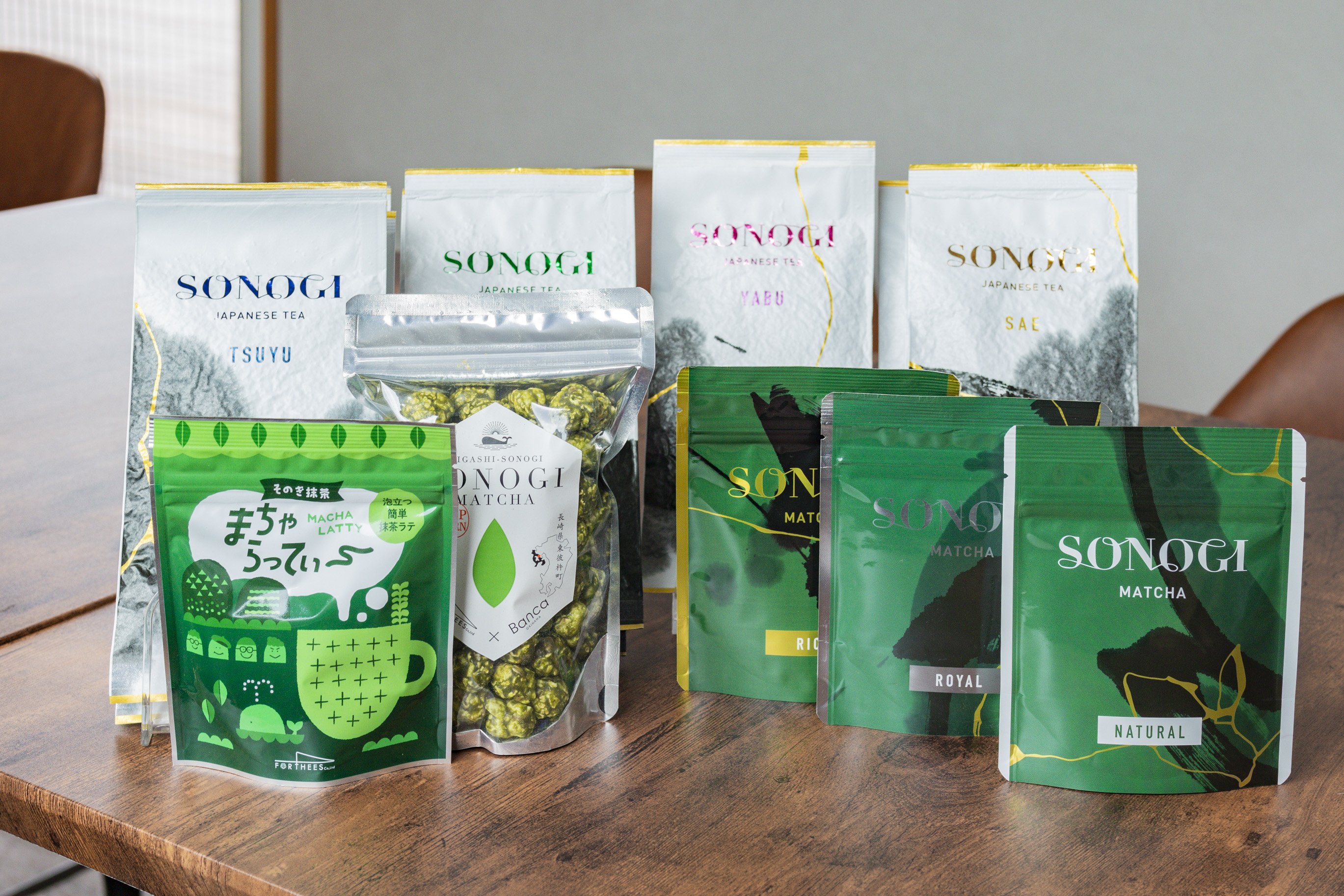 時間と労力をかけて作られた「そのぎ茶」を楽しめるのが、FORTHEESの敷地内に2025年オープンしたカフェ「ちゃいむ」です。抹茶ラテやスイーツの提供に加え、「FORTHEES」の玉緑茶、抹茶、お湯に溶かすだけの抹茶ラテ、抹茶味のポップコーンなどを販売しています。