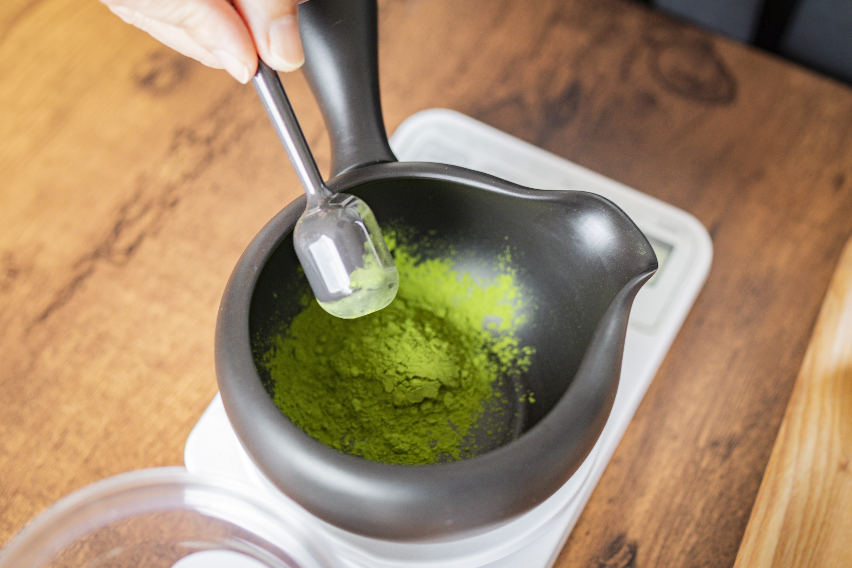 ②「FORTHEES」の抹茶4gに50cc〜60ccのお湯を加え、点てます。