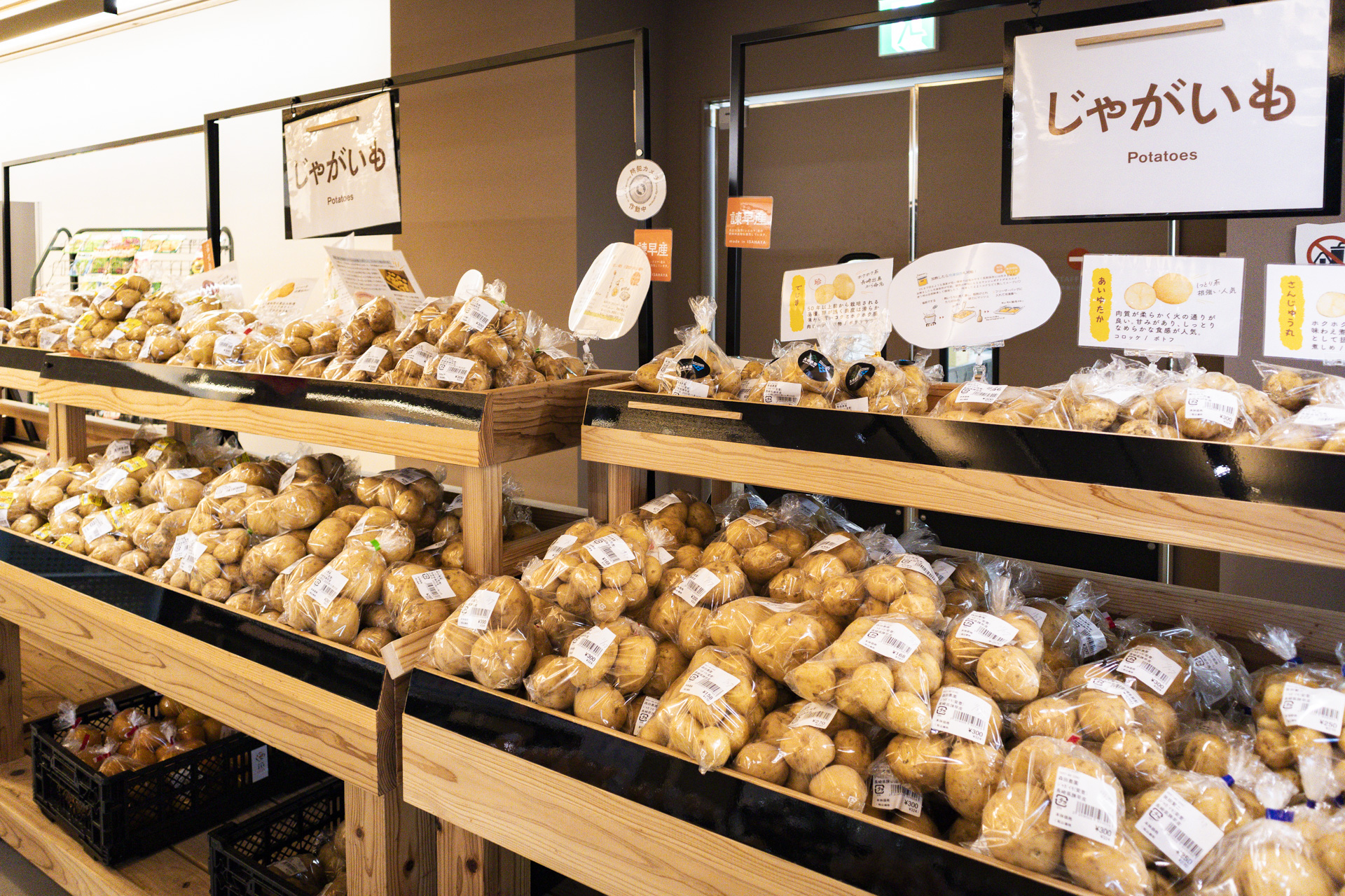 最も力を入れているのは、店の名前にもなったじゃがいも。一際広いコーナーに収まりきらないほどの種類と量が並んでいます。「今(※取材時11月末)ようやくじゃがいもの収穫が始まったところで、まだまだ量は少ない方なんですよ」と店長の杉内エリカさんが教えてくれました。