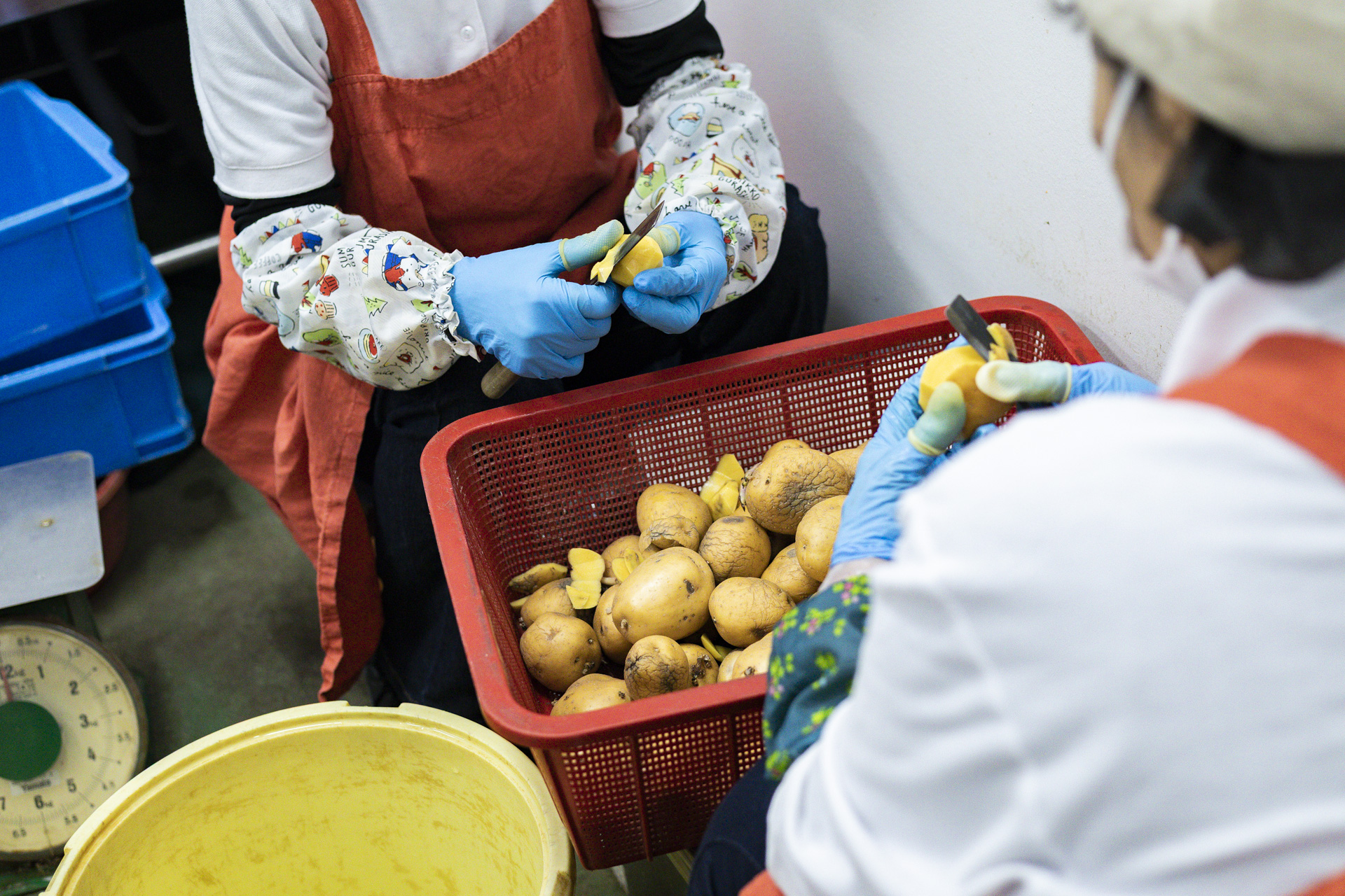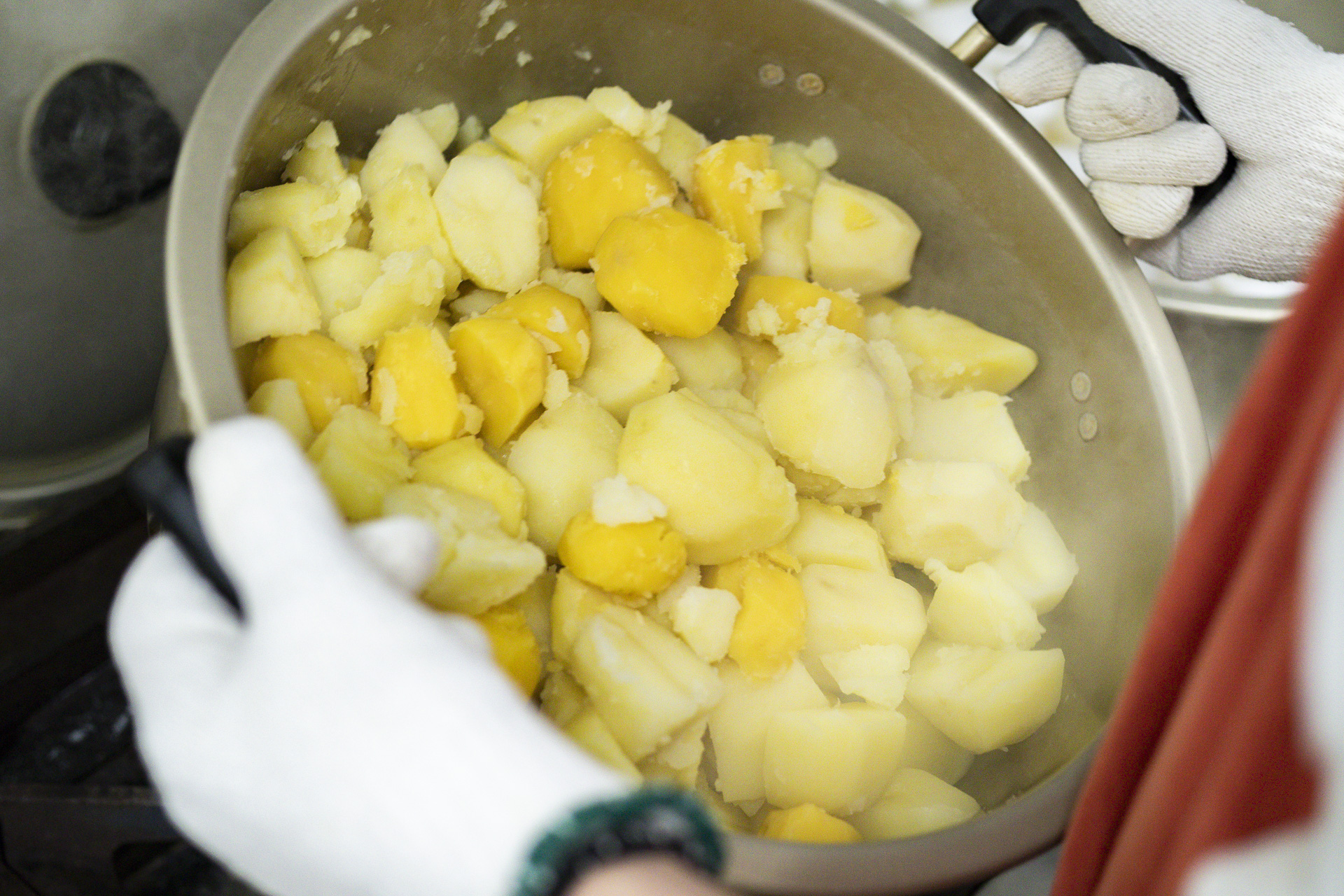 鍋の中のじゃがいもの色が気になり、品種を尋ねると、「その日によって異なるんです。今日は、ながさき黄金、にしゆたか、さんじゅう丸ですね」と杉内さん。甘み、滑らかさ、食感などを考えながら、毎日2〜3種をブレンドしているのだそうです。