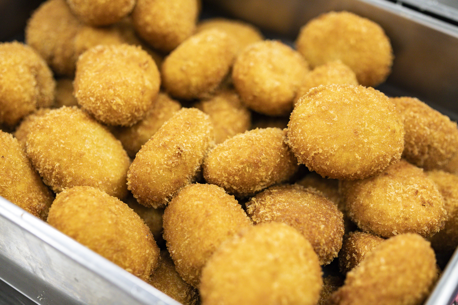 茹でて潰したじゃがいもに、諫早産のにんじん、玉ねぎ、豚ひき肉を炒めた肉ダネを合わせ、成形したら、衣をつけてフライヤーへ。一日中揚げたてが店頭に並ぶのも人気の秘密です。