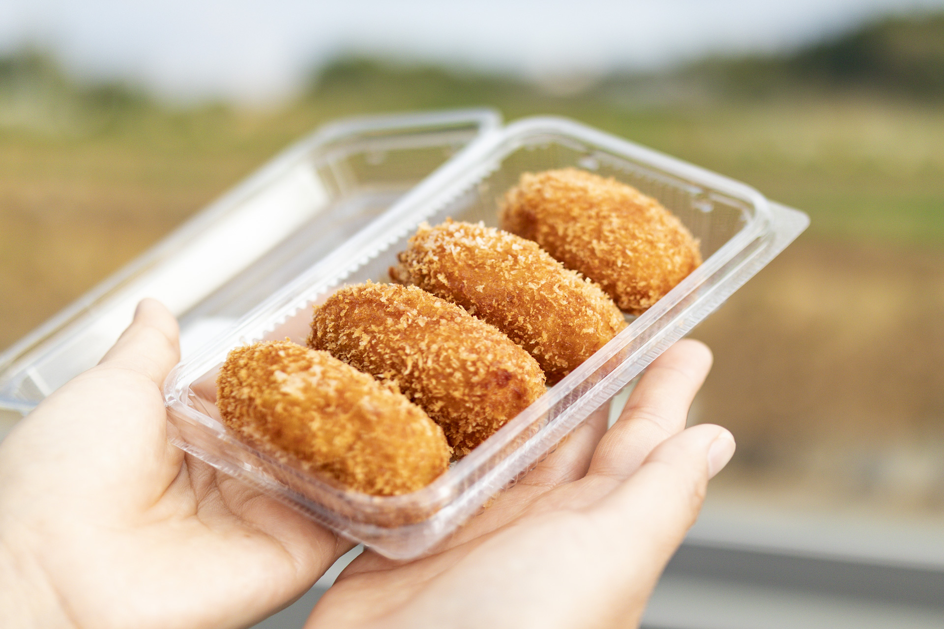 畑の真ん中で、揚げたてのコロッケをほおばると、湯気があふれました。しっとり、ホクホクとした味わい。すこし甘めの長崎らしい味付けも食欲をそそります。スタッフの方においしさの秘訣を伺うと、「地元産のじゃがいもを使うことと、あとはまごころかな」と笑顔が返ってきました。