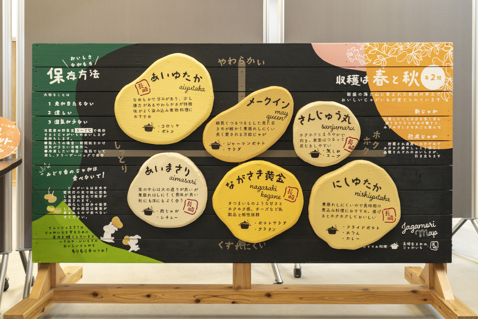 あいゆたか、にしゆたか、あいまさり、さんじゅう丸……。早口言葉のようにも聞こえますが、どれも長崎生まれのじゃがいもの品種。店内には、品種ごとの味の違いや調理の仕方をまとめた大きな看板が設置されており、悩めるじゃがいも・ビギナーも一安心です。