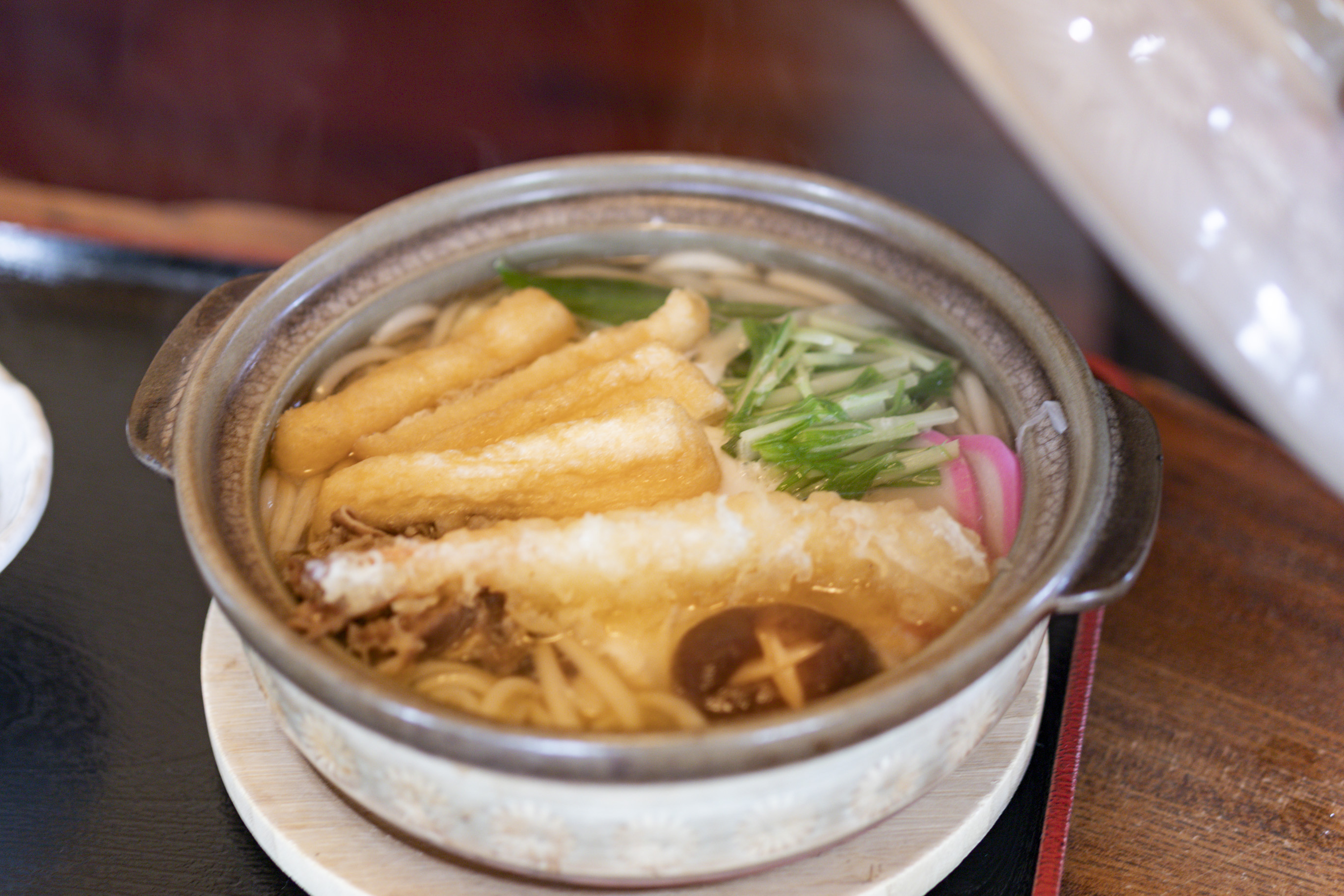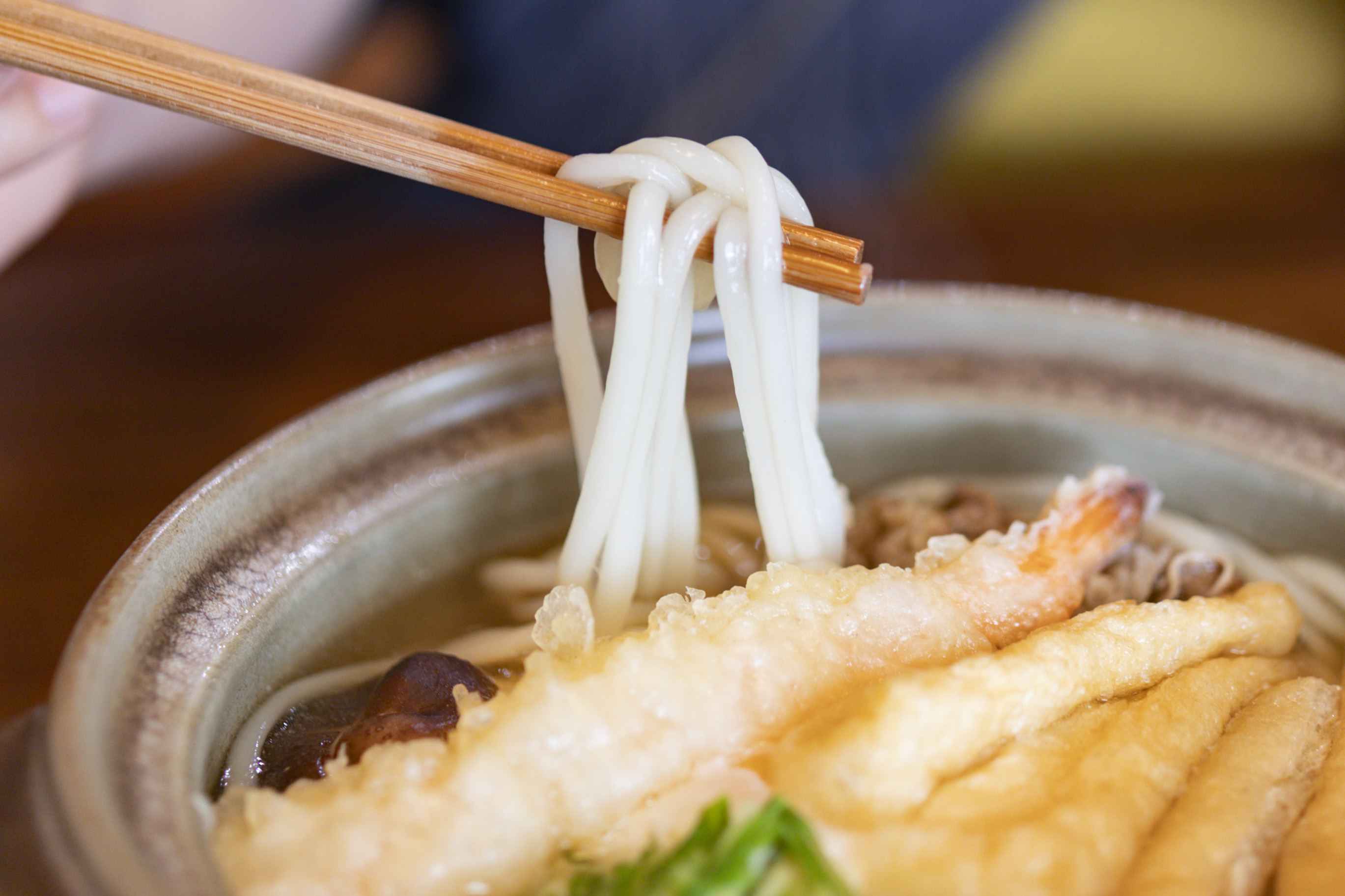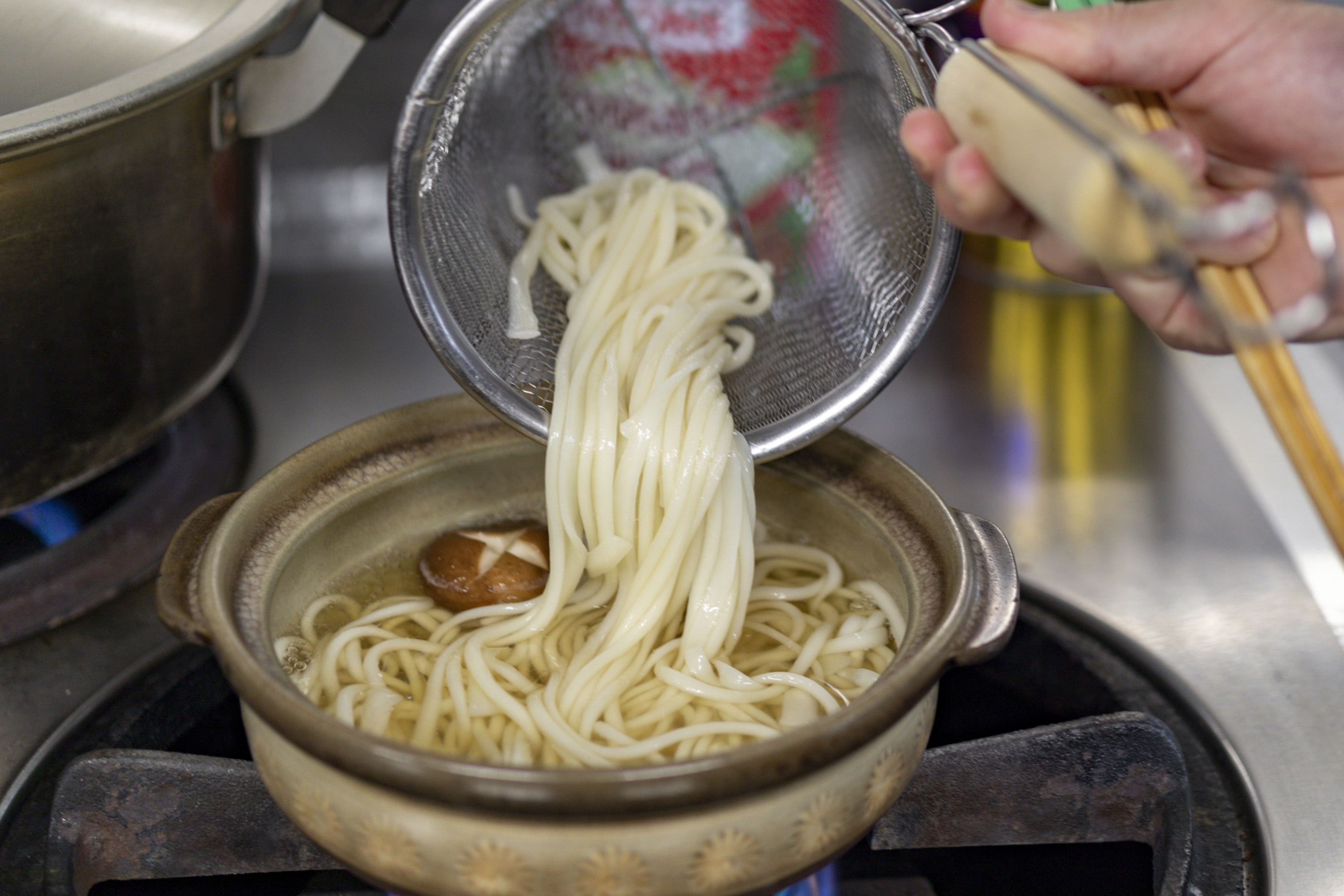 もう一品のオススメは「鍋焼きうどん」。ぐつぐつと煮込まれているのに、特有の強いコシと喉ごしはしっかり残っています。その秘密は、五島手延べうどんの製法にあるのだと祥雄さん。製麺工程で麺の表面に島内産の食用椿油を塗り、熟成を重ねることで、独特の強いコシが生まれ、煮崩れを防ぐ効果があるのだそうです。