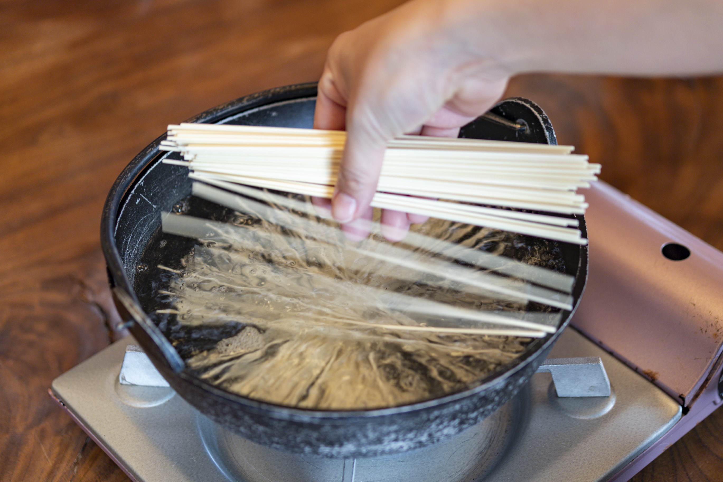 お店いちばんのオススメのメニューが、この「地獄炊き」。五島手延べうどんの最もポピュラーで、最もシンプルで、最も野趣あふれる食べ方です。一般的なうどんに比べ、半分以下にも見えるその細さも特徴の五島手延べうどんを、ぐらぐらと沸いた鍋に入れ、5分ほどゆでればできあがり。元々は漁師の活力源として愛されてきた食べ方で、その名の由来は、食べた人があまりのおいしさに「至極(しごく)おいしい」と言った言葉が、「地獄」と聞き間違えられたからという説もあるのだとか。