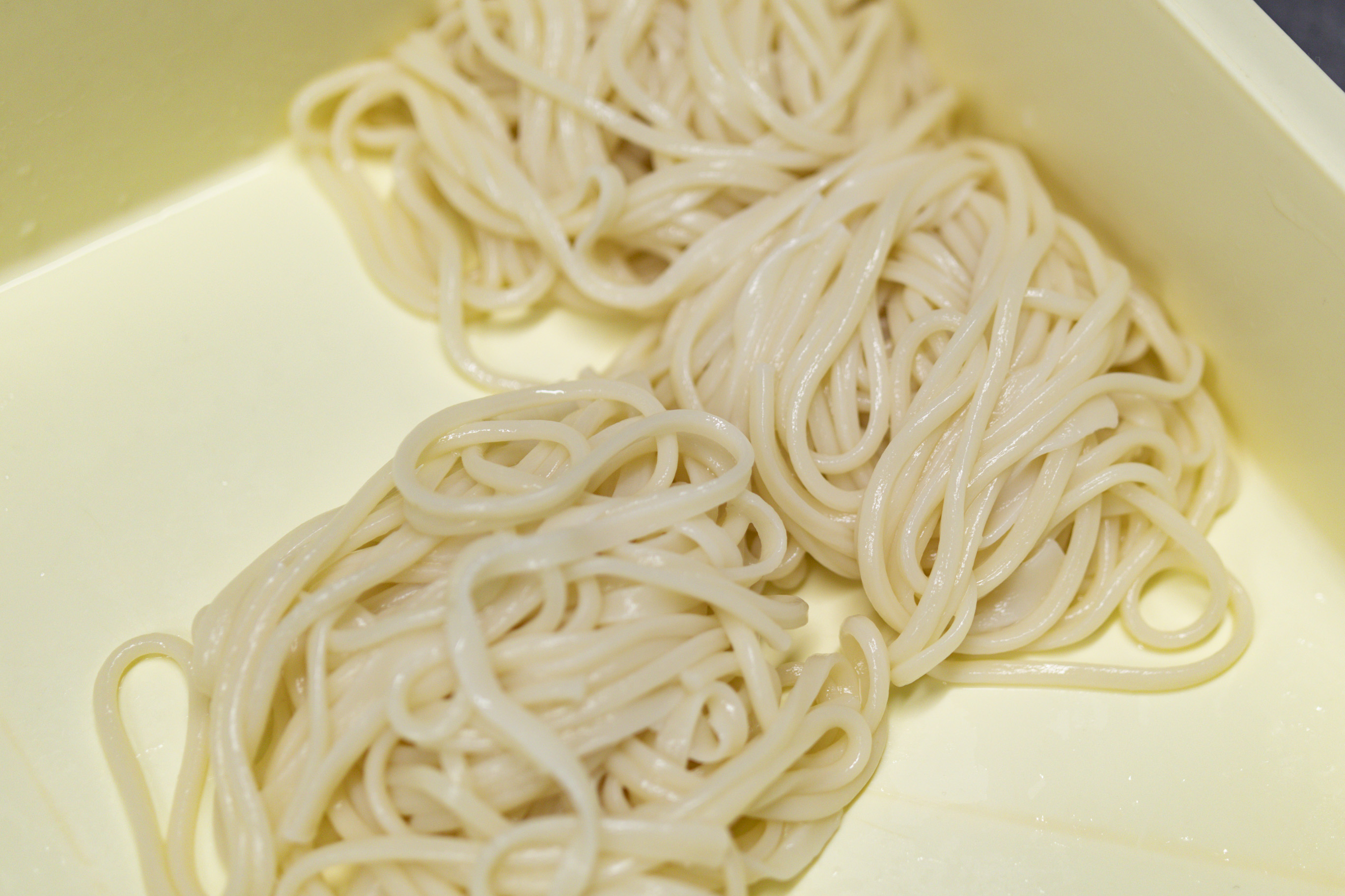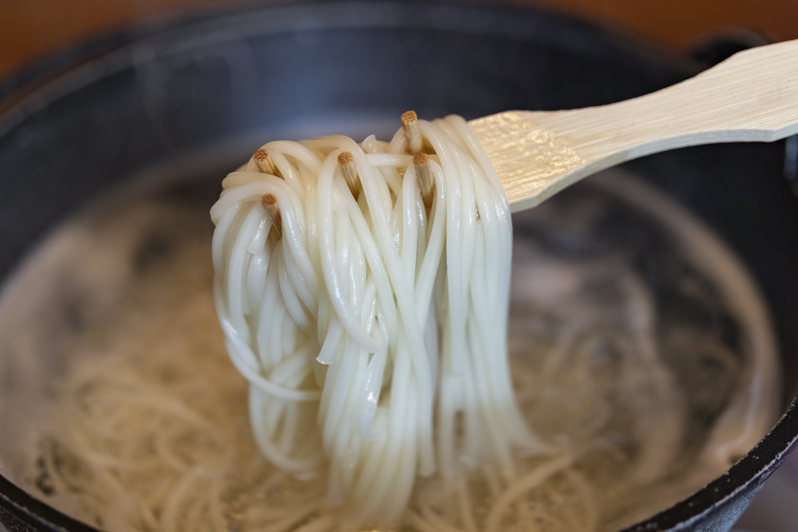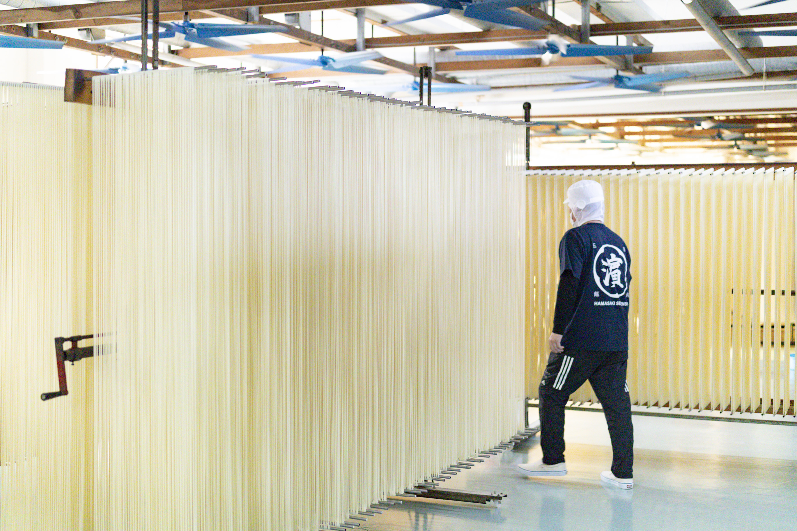 生麺の魅力を、「モチっとした食感と食べ応え、手延べ感のある不均一な太さの麺」と話す洋敬さん。よく見ると、ところどころ平たい部分があります。麺を引き延ばす際に、棒にかかっていたU字型の部分で、“ふし”と呼ばれています。乾麺にする時は切り落とされてしまうため、なかなかお目にかかることのできない希少な部分です。のばす時に最も力が加わり、かつ乾燥のための風もよく当たる場所なので、小麦の旨みが凝縮され、地元の職人の中には「ふしこそが一番うまい」と話す人もいるほどだそう。手延べ製法ならではの味に出合える瞬間です。