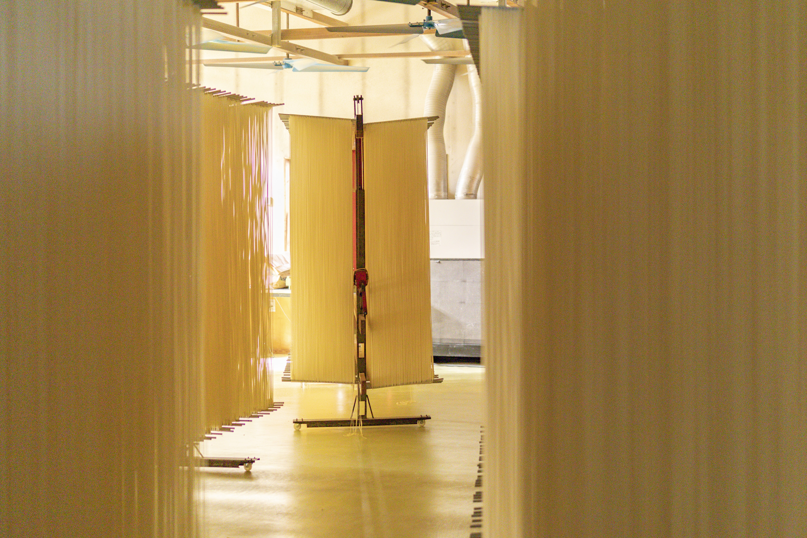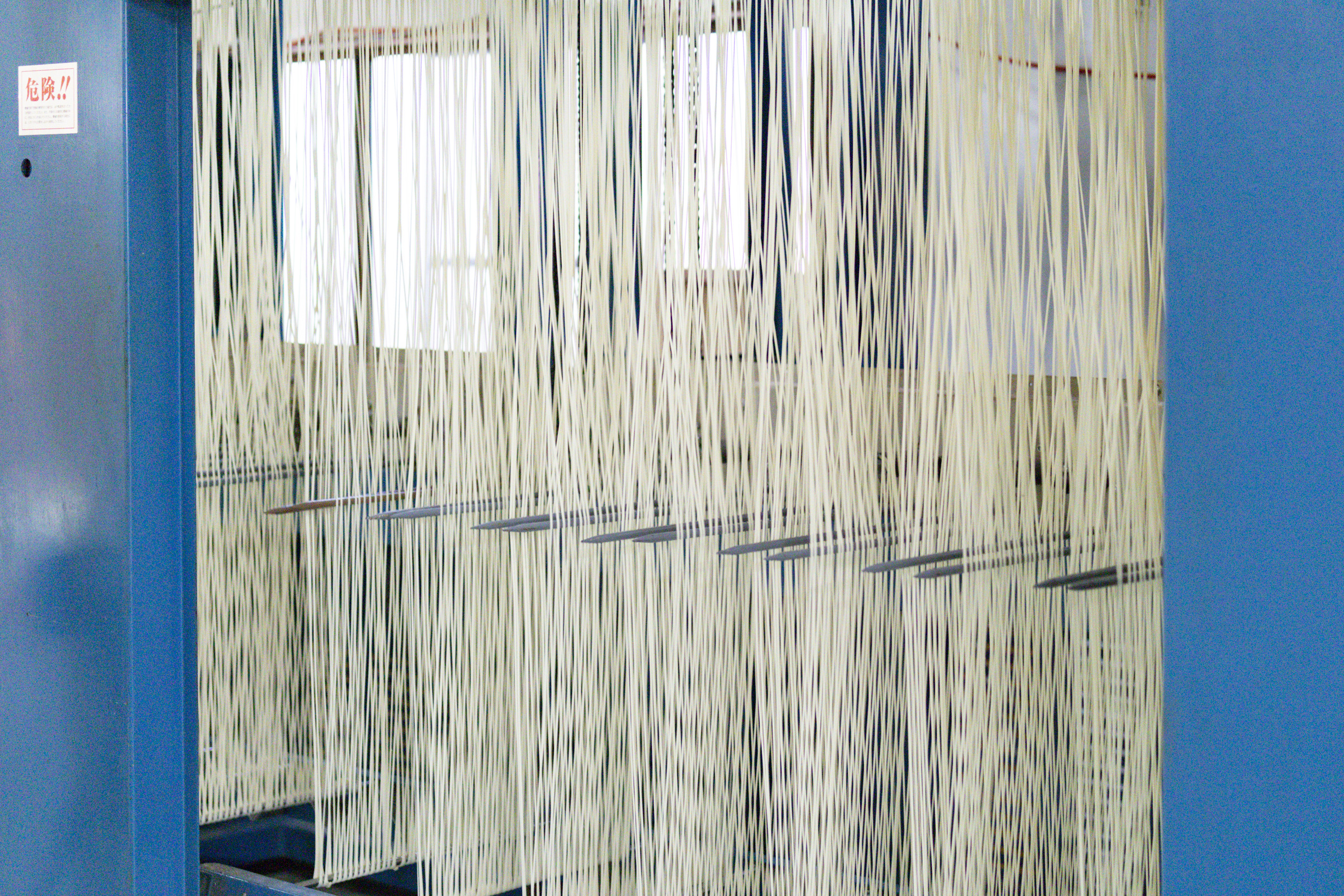 この五島手延べうどんがどのように作られているのか気になり、店から車で10分ほどの場所にある製麺所を見学させていただくことになりました。工場内の2メートルほどの長さの「ハタ」と呼ばれる干し具には、おびただしい数の麺が吊るされています。生地の練りから乾燥までをその日のうちに終えるため、祥雄さんと洋敬さんは毎朝5時に麺づくりを始めます。小麦粉に混ぜるのは、島の水と海でとれた塩。同じ配合でも、気候や季節の変化で麺の状態は様変わりするため、水の量や温度、塩加減には細心の注意と、職人の研ぎすまされた感覚が必要なのだと言います。