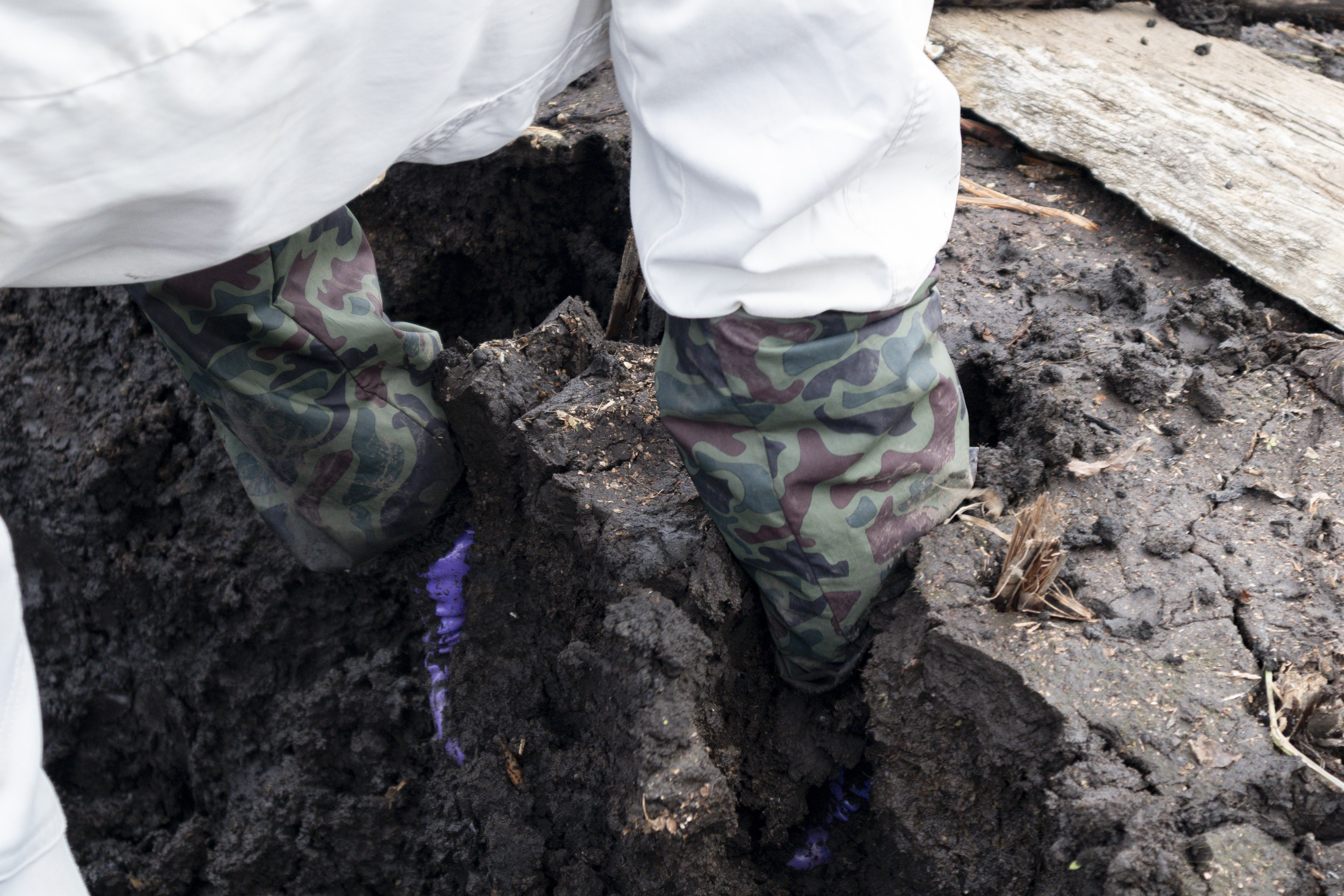 一方で、この良質な土が、収穫の際は最大の難関になります。水分をたっぷり含んだ柔らかな土では、水圧で掘る一般的な方法では掘ることが難しく、完全手作業で収穫するほかありません。腕を土の中に埋め、土のかたまりを重機のように掘り上げながら、れんこんを探す𠮷村さん。