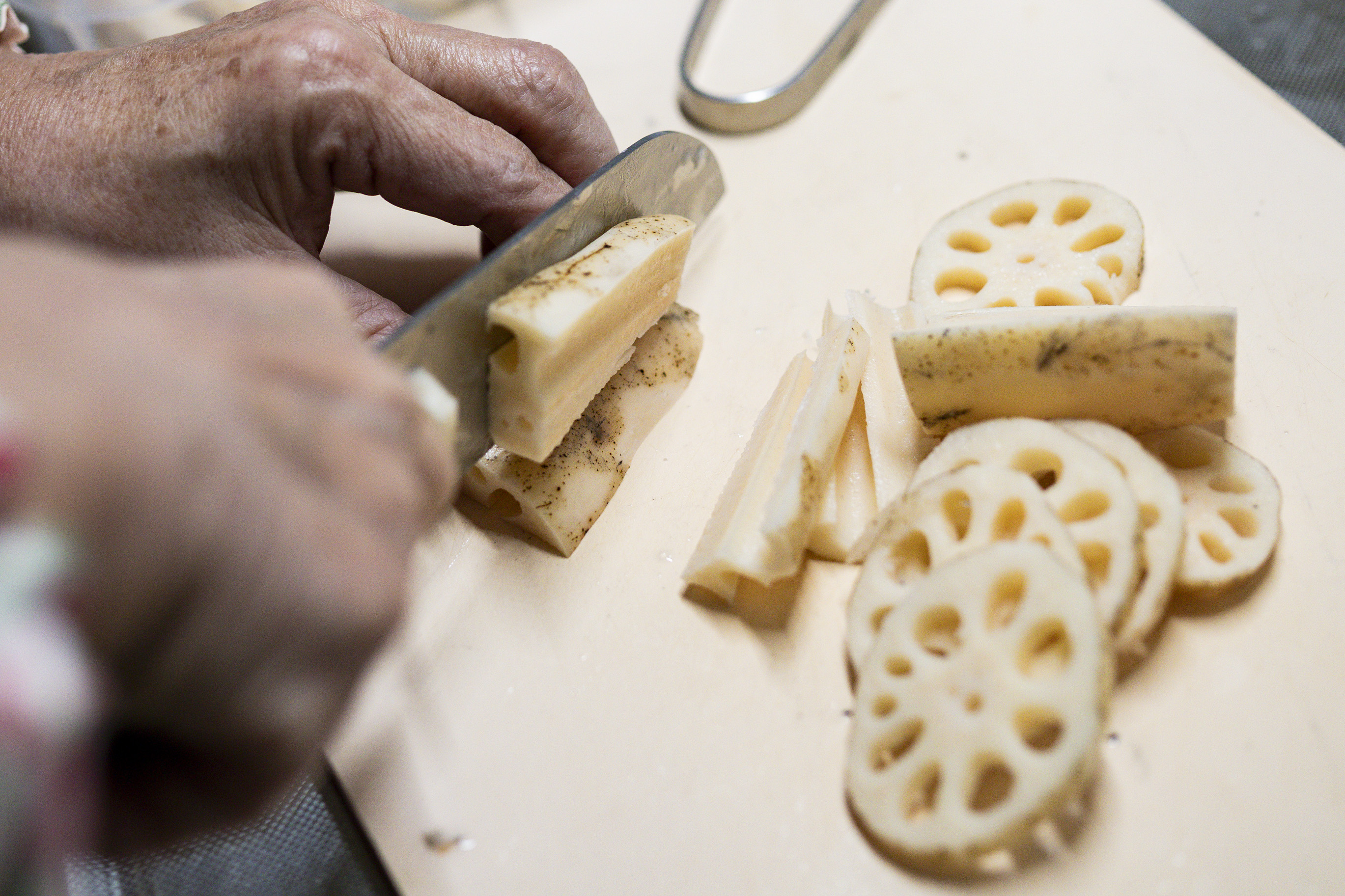 ①唐比れんこんを、輪切りと縦切りにカットします(食感の違いを楽しむため)。