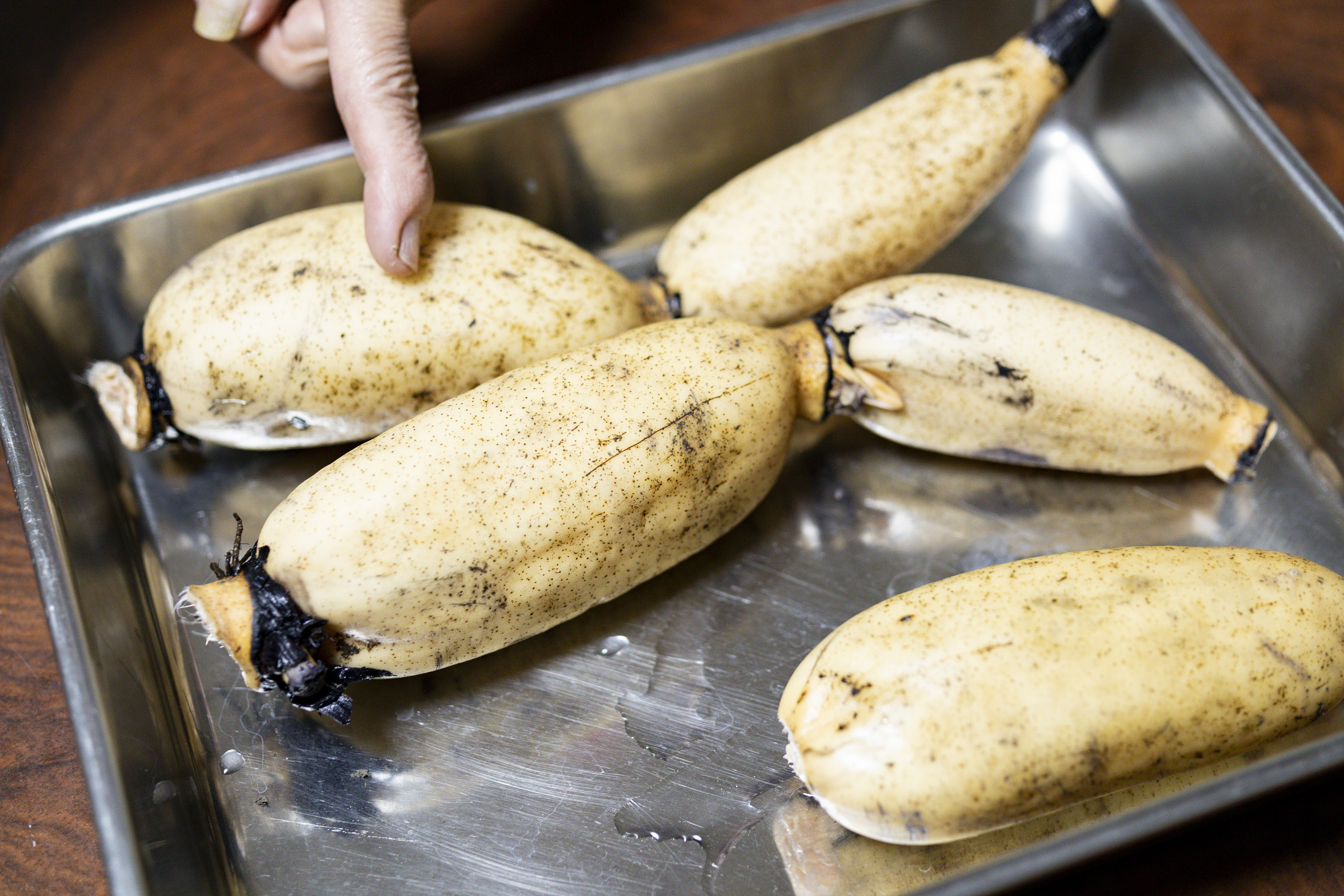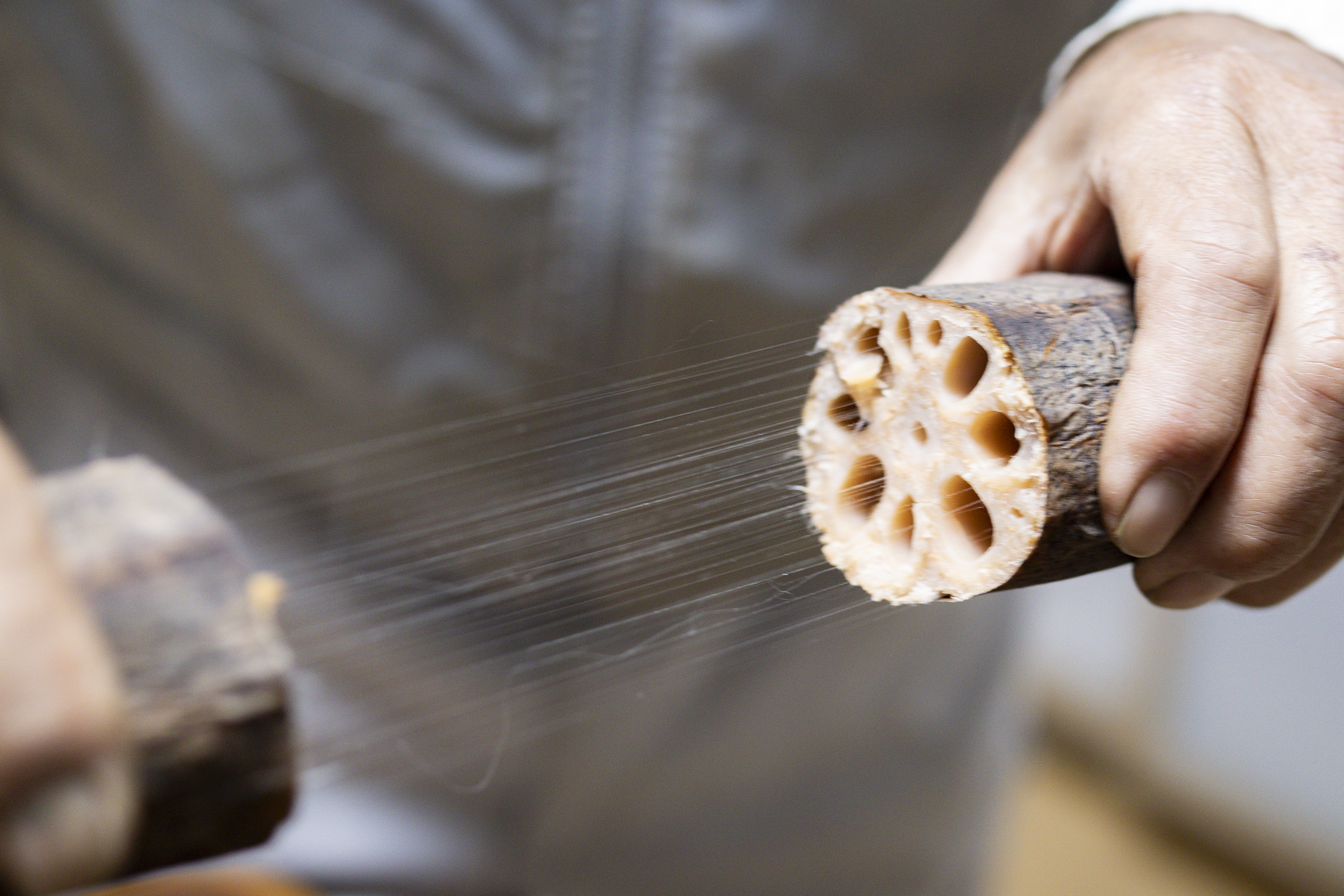 掘り出されたれんこんは、ふっくら丸い一般的なれんこんとは異なり、細長いのが特徴です(4節で1メートルを優に超えています)。スーパーで見かけるれんこんは品種改良された「金澄(かなすみ)」と呼ばれる品種が主流ですが、唐比れんこんは、中国伝来の「備中種(びっちゅうしゅ)」。昔ながらの姿を今に伝える、全国的にも珍しいれんこんです。