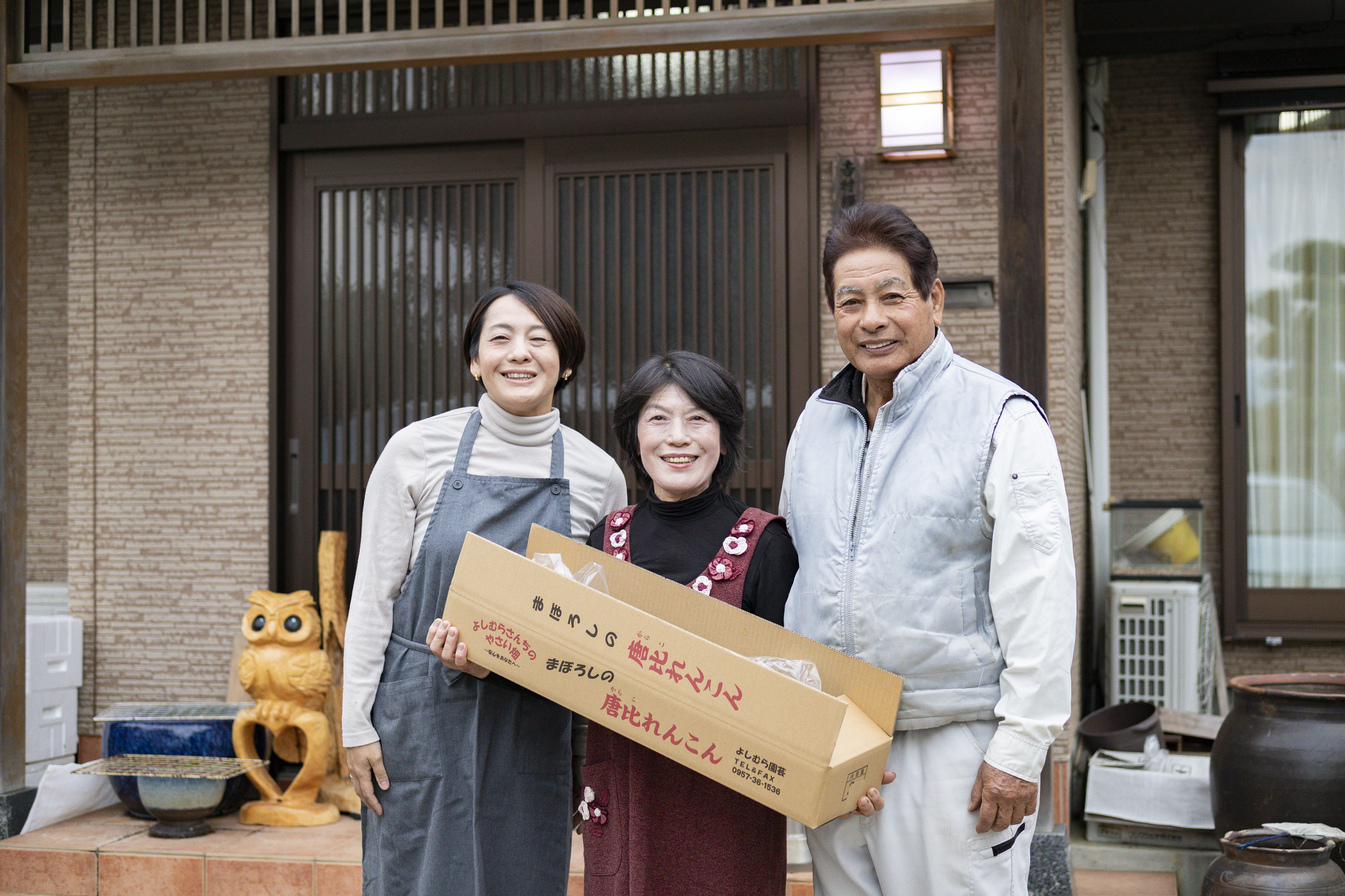 唯一無二の味わいと、この土地ならではのストーリーを絶やさず、50年近くの間、唐比れんこんを大切に守りつづけてきた𠮷村さんご一家。 「太古の恵み」のおいしさを、ぜひ一度味わってみてください。(写真右から、𠮷村輝幸さん、節子さん、長女の山城和子さん)