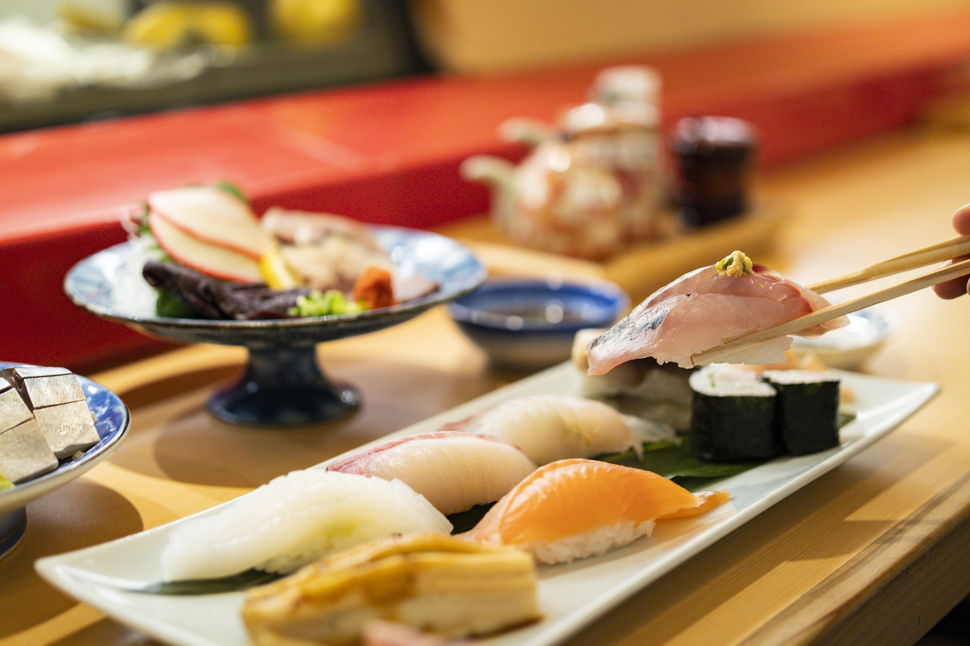 あっという間に、看板メニューの「特選長崎にぎり」が出来上がりました。アオリイカやヒラマサ、マダイ、マアジ(もしくはシマアジ)に、国境の島・対馬産の煮アナゴなどが並びます。アオリイカの甘み、ヒラマサのコリコリとした食感、マアジの香りなど、一口ごとに異なる個性豊かな味わいが、長崎の海の奥深い魅力を感じさせます。