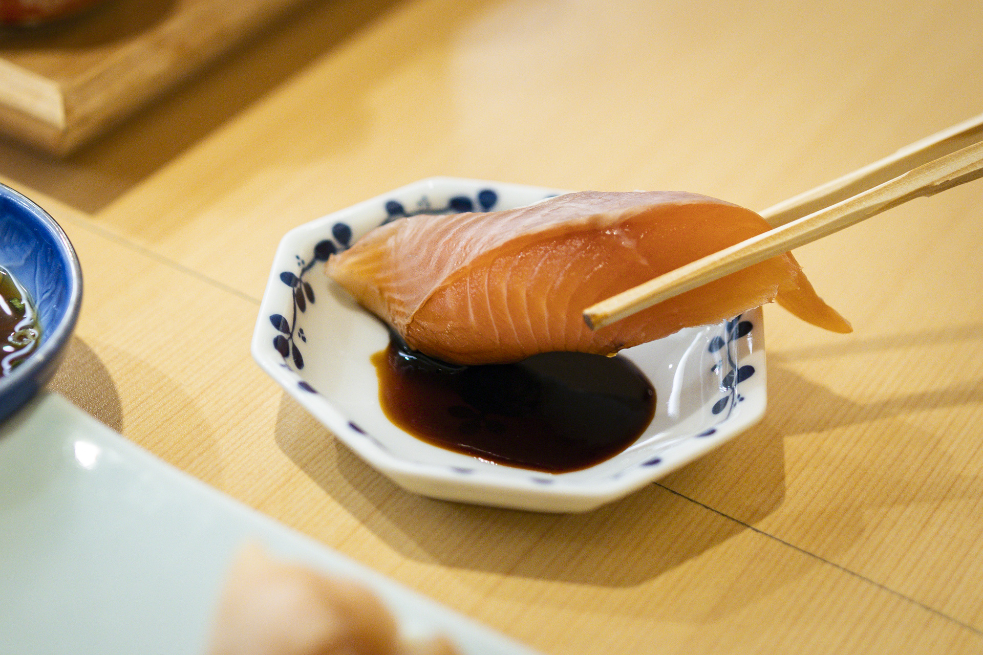 「長崎は、山と海の距離が近いでしょう。山から栄養がたくさん海に流れて、その栄養豊富な海で育つ魚は、脂ののりが段違いなんです」と横尾さん。脂ののった身と新鮮さを損なわないよう、手のかけ方は必要最低限に。手早く握るのがしょうぶ流です。