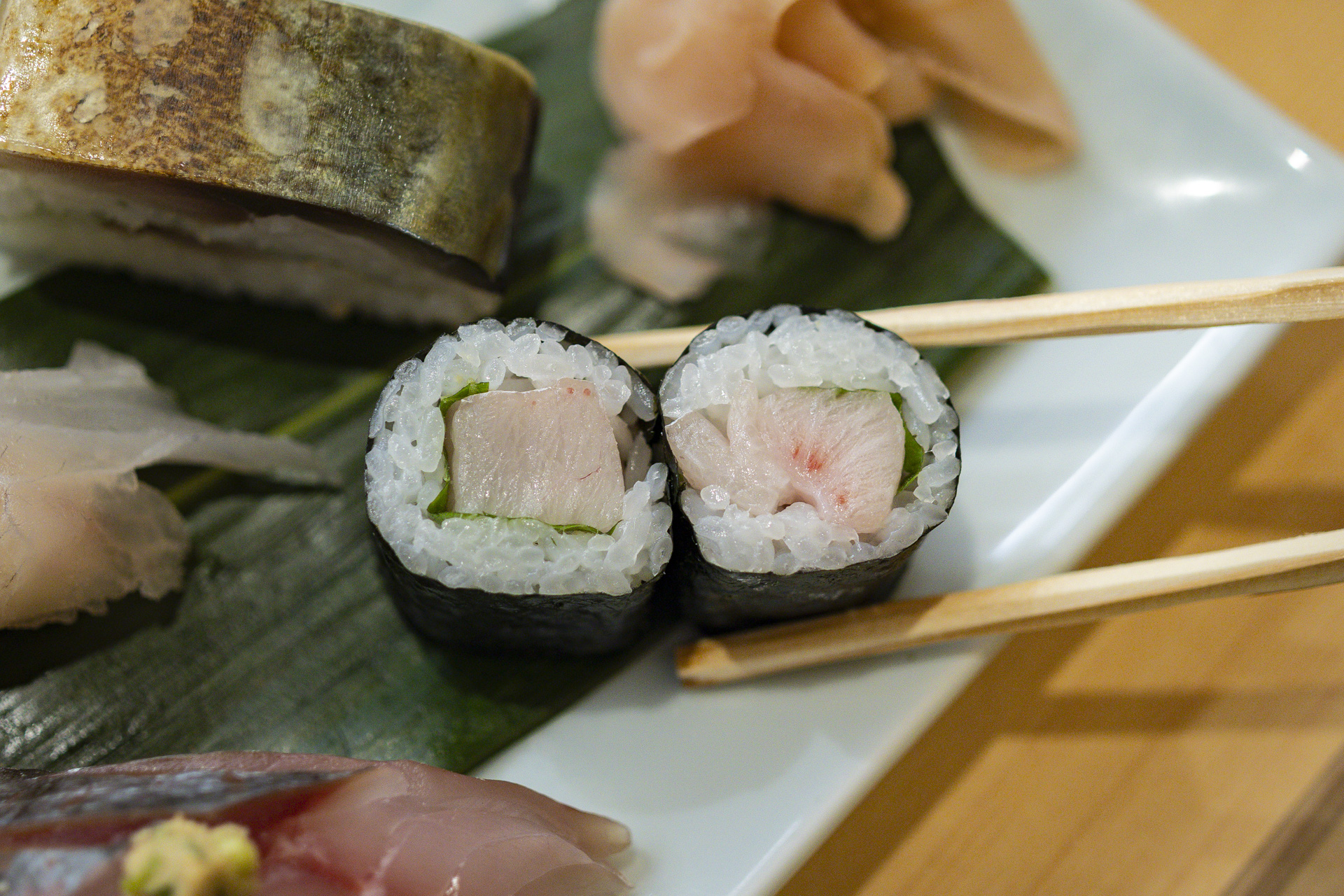 「県外のお客さまはよく驚かれる」と話すのが、こちら。マグロではなく、ブリやヒラマサなどの白身魚を巻いた「白鉄火」です。歯ごたえのある魚を好む長崎県民熱愛の一品です。