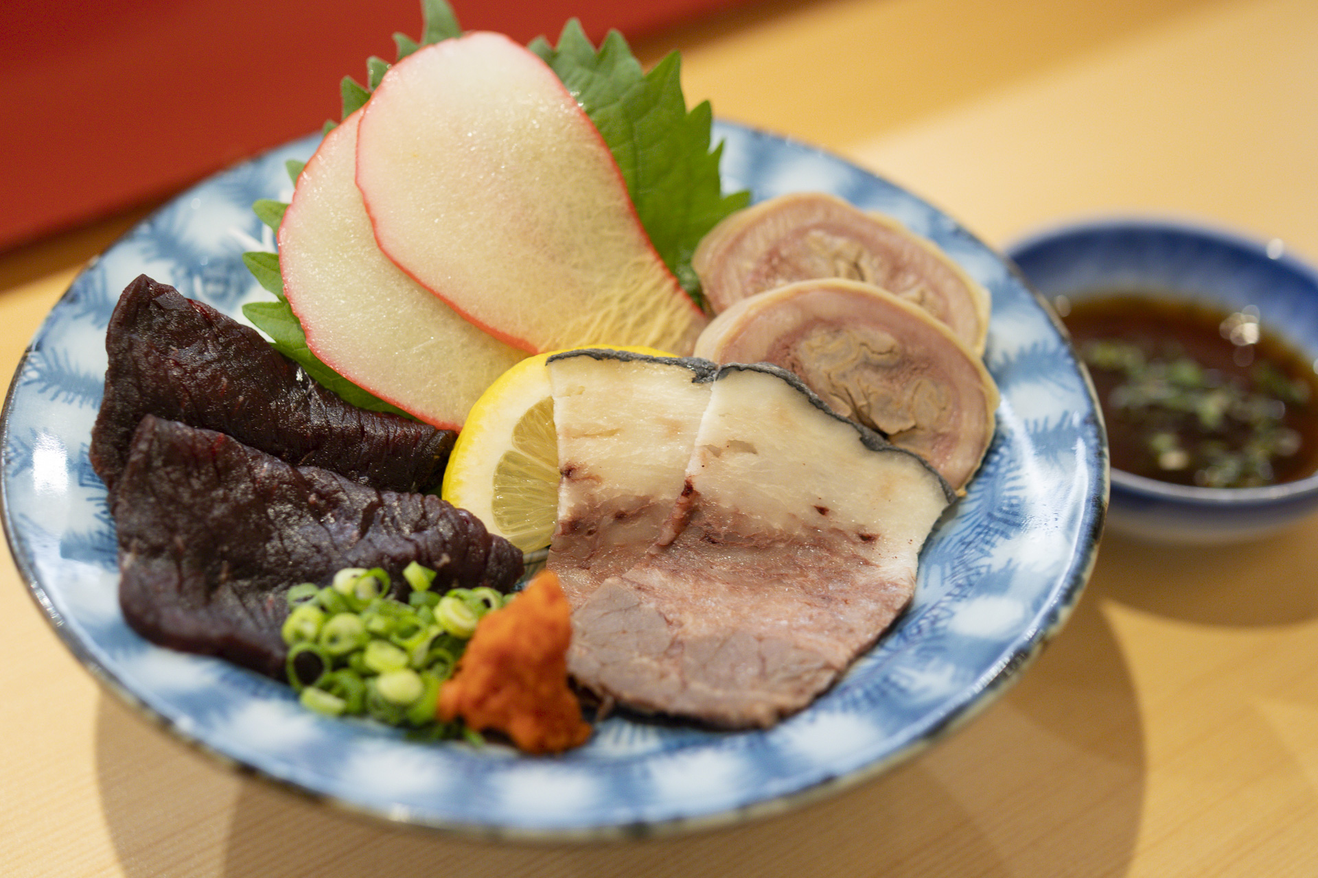 そのひとつが、「鯨盛合せ」。伝統的な捕鯨の歴史を持つ長崎ならではの一皿です。写真上から時計回りに、ベーコン、百ひろ(腸)、さえずり(舌)、赤身と並び、部位ごとに全く違った味わいを楽しむことができます。